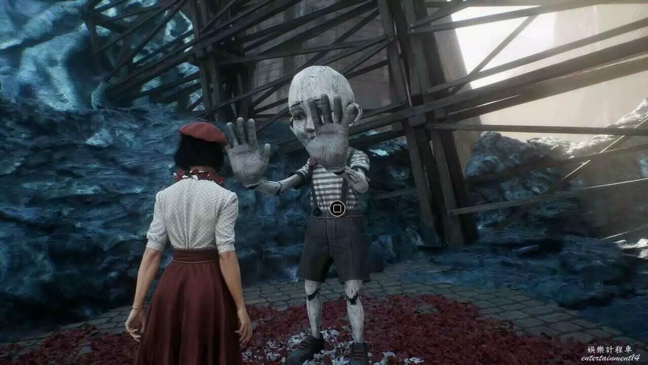 朝舞台方向看然後往右轉,即可在陰暗的角落裡看到一隻默偶。