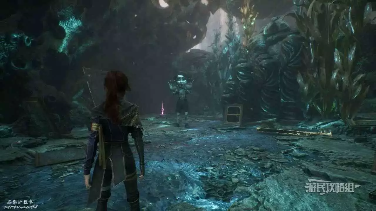 電梯到達目的地之後,穿過前方的橋,略微左轉,可以看到一根發光的繩索,使用繩索往下走。