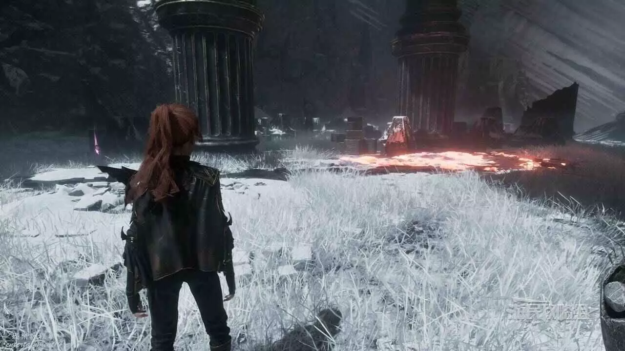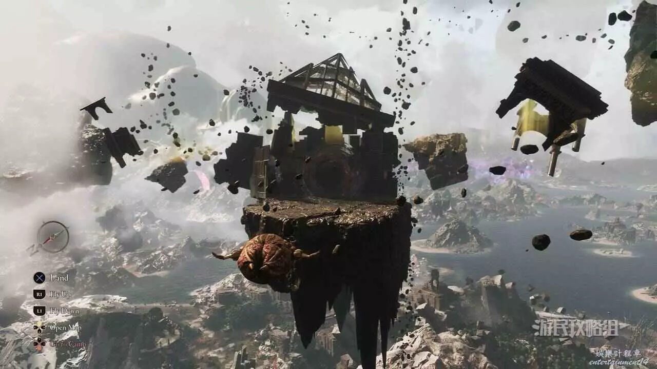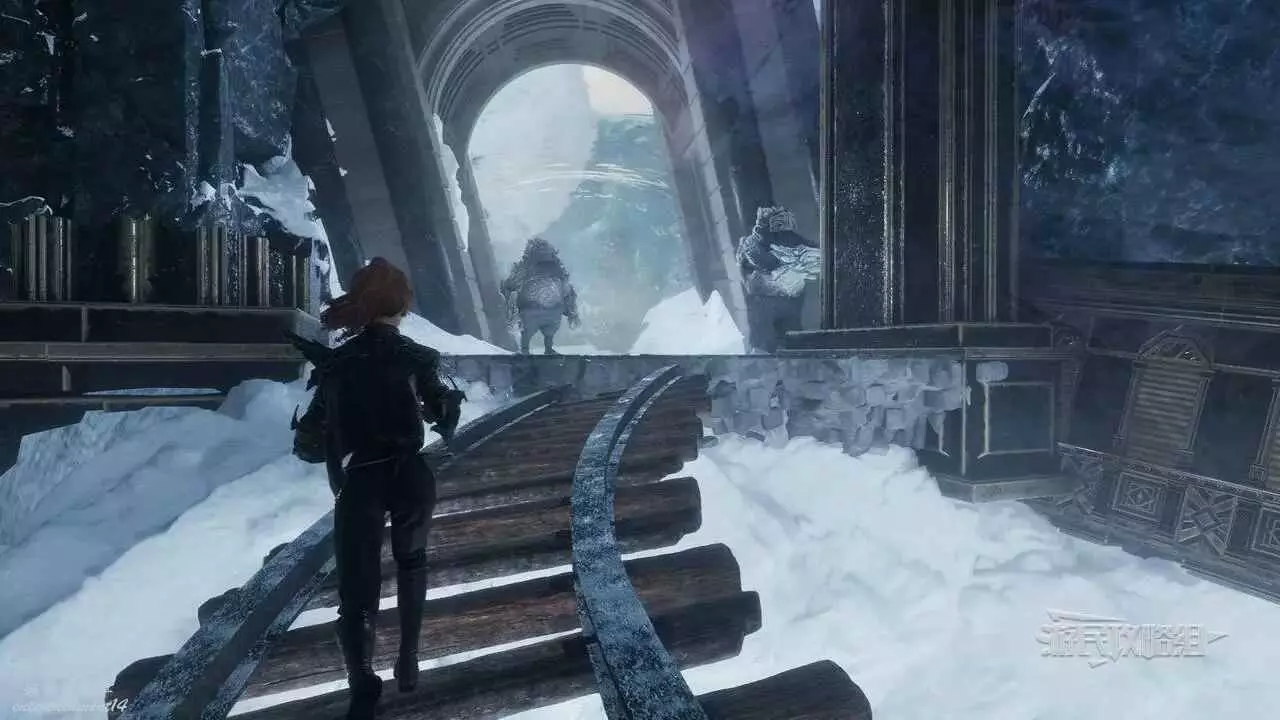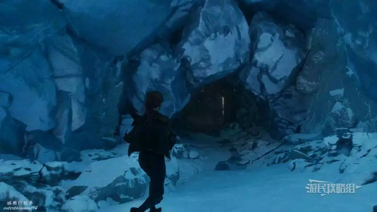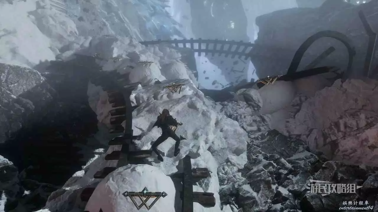 到達結冰的懸崖後,往東走,使用抓鉤穿過缺口,靠近前方牆壁可以看到攀爬點,使用攀爬點往右上方爬,進入北邊的拱門。