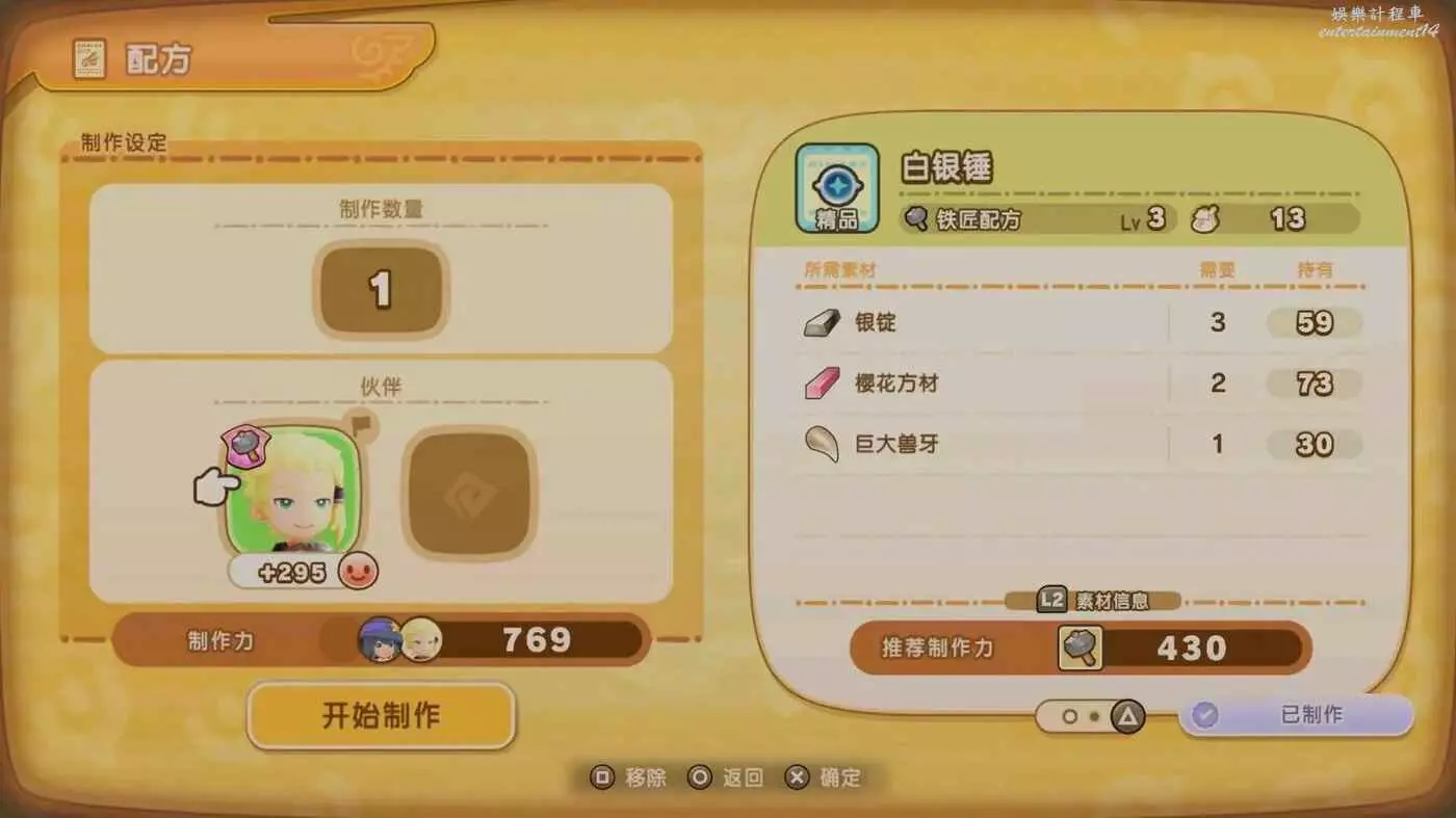 也就是說最強的製作力需要玩家工具上兩個詞條均是同種特效,夥伴的話,如果夥伴好感度技能有配方對應的特效,就需要兩條增加製作力的詞條。如果夥伴好感度技能沒有對應的特效,那麼工具上需要一條特效詞條以及一條增加製作力的詞條。