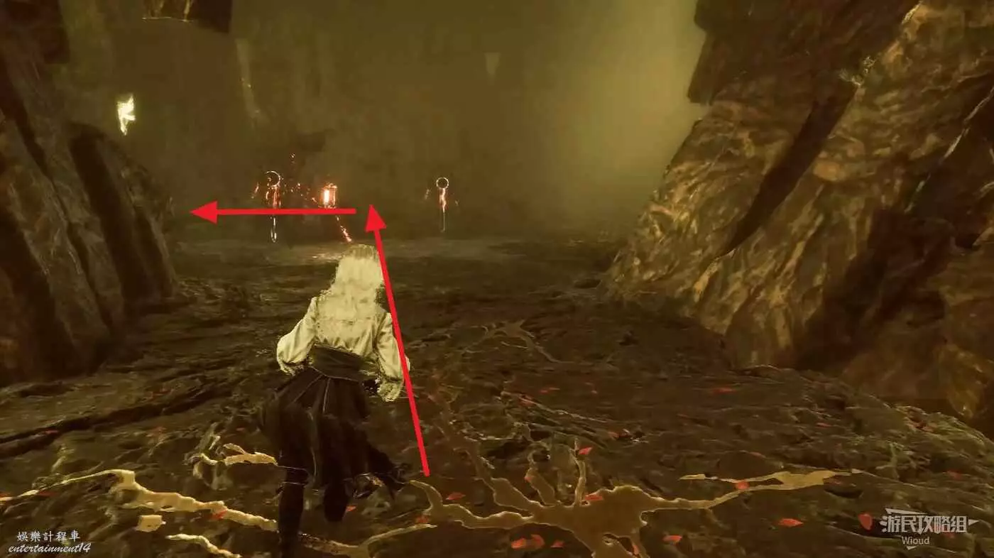 走到之前指出的深淵入口,先不要進去,從兩側繞到後面,跳到對面屋頂沿路走到一個洞穴。