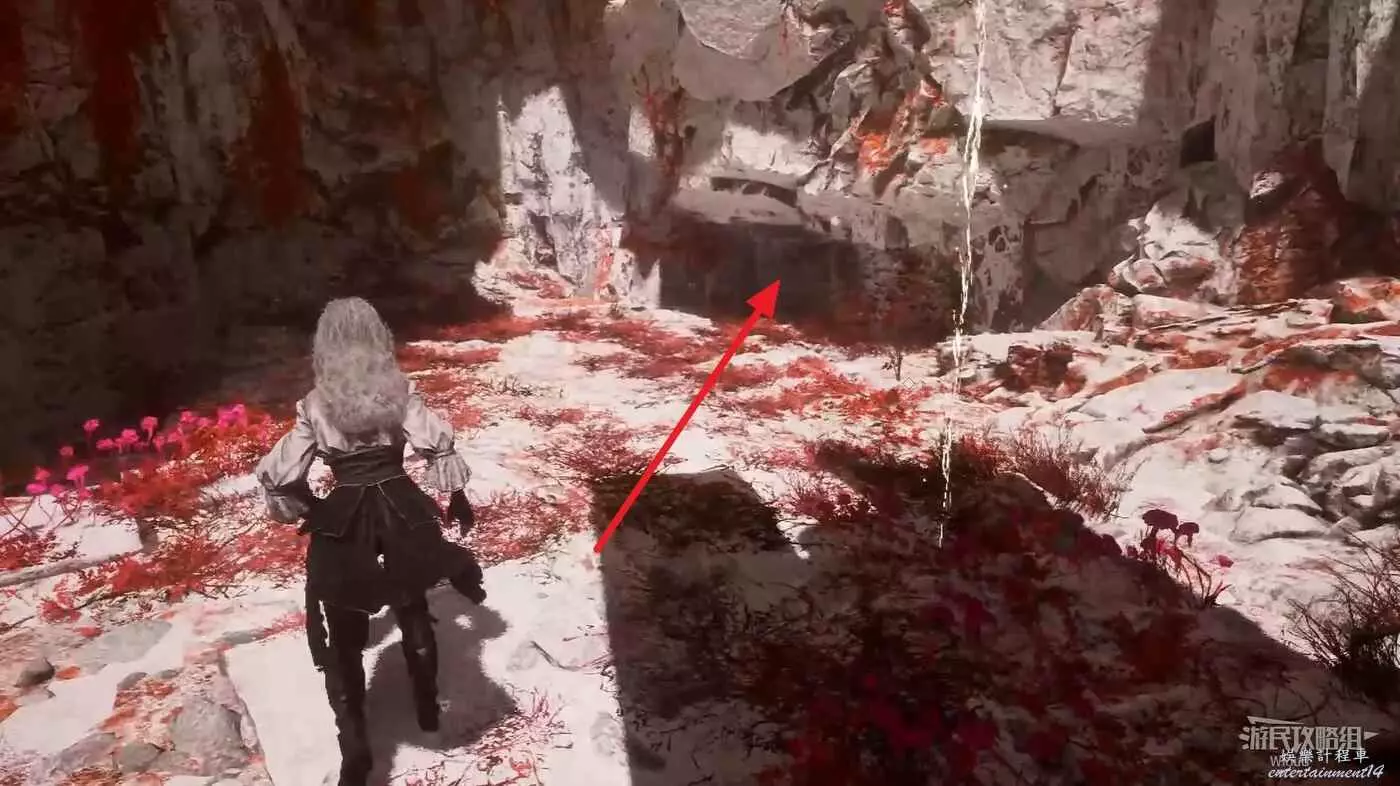 進入緋紅森林先沿著前方圓盤跳到對面平台,往前走的時候,左側有個缺口。