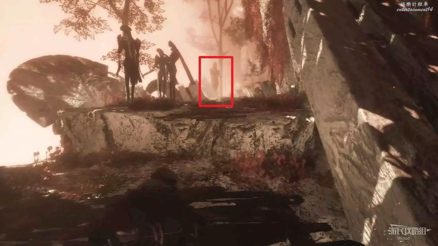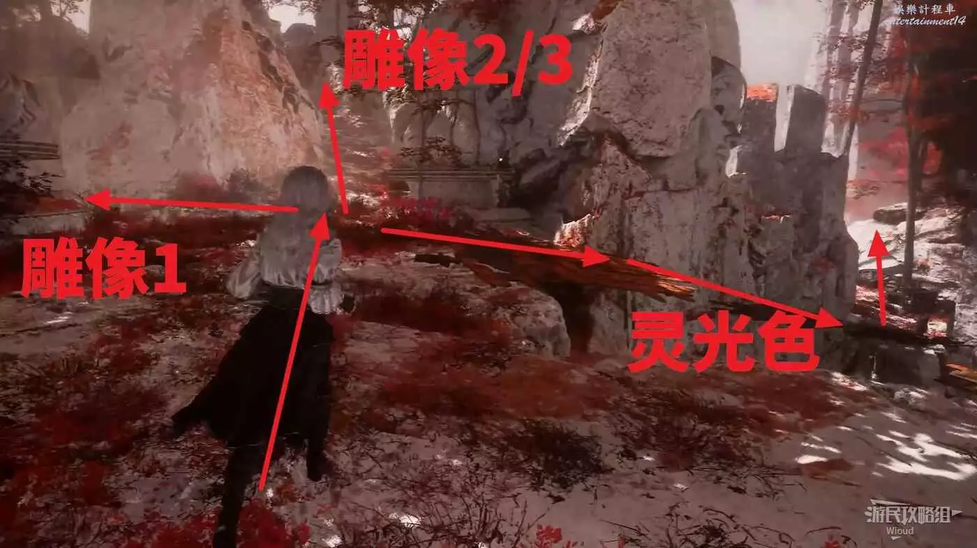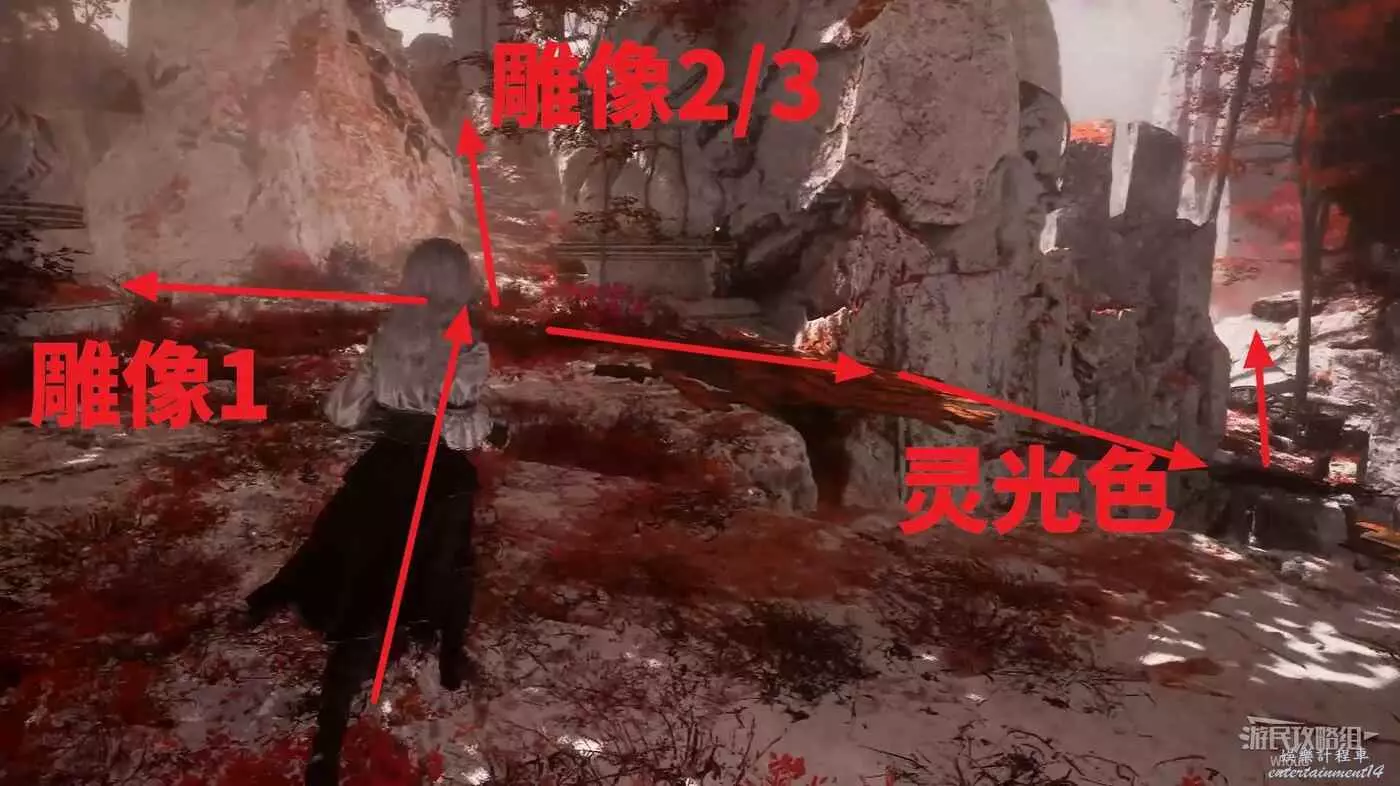 啟動開闊區域旗幟【三劍合璧】時往右後方繞,有個可以跳上去的平台,前方找到一個紅色雕像,與其互動將其啟動,我們還需要找到兩個雕像完成解謎。