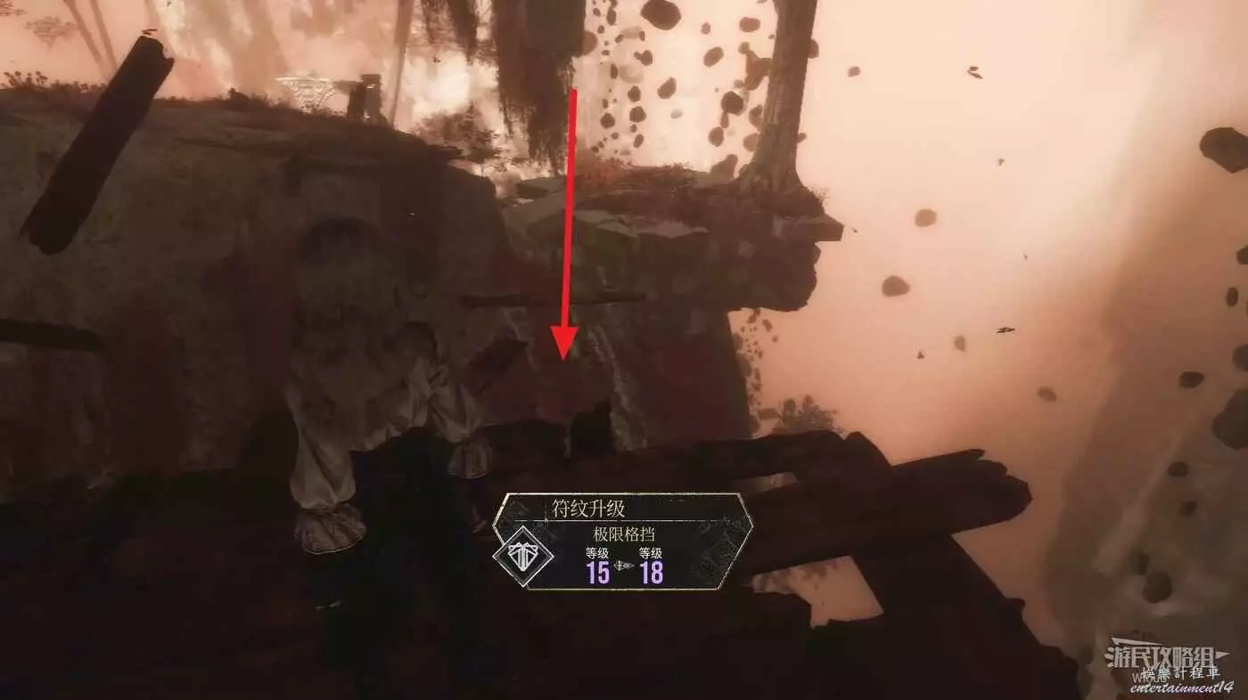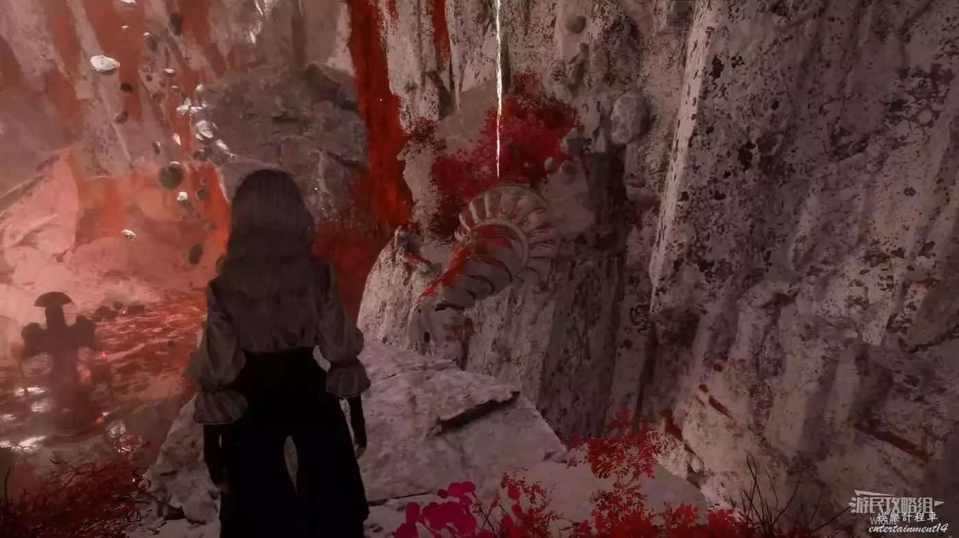 最底部右側有個【靈光色】可撿,然後沿著下圖箭頭所示跳到前方左側的平台,爬牆上梯子上去,再跳到旁邊的平台爬繩索到頂層。