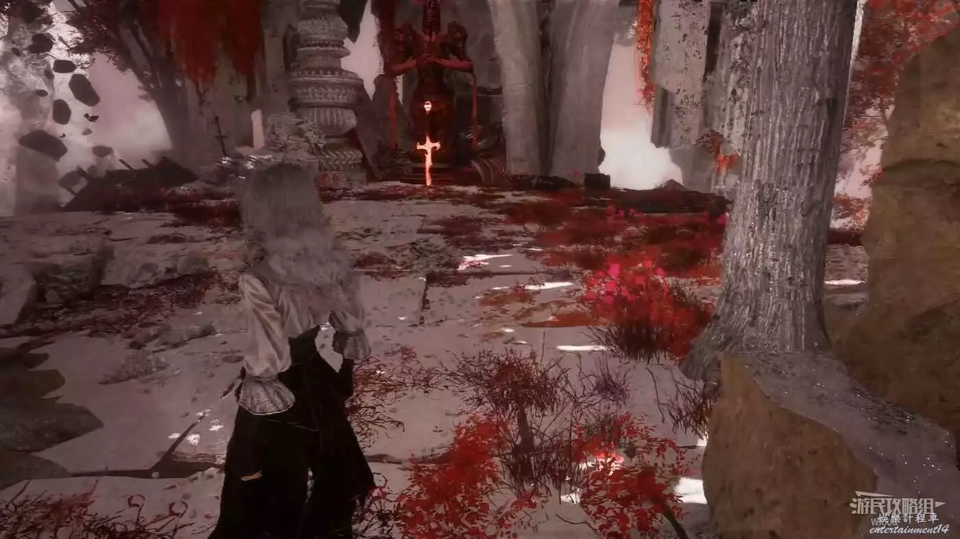 與正前方的雕像互動開啟戰鬥,將其擊敗在前方碗裡獲得武器【鉤刃劍】。