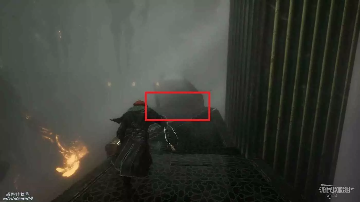 回到樓梯口往前看,紅框所示處有個可爬的鉤爪點,爬到高處盡頭平台可撿到此符紋。