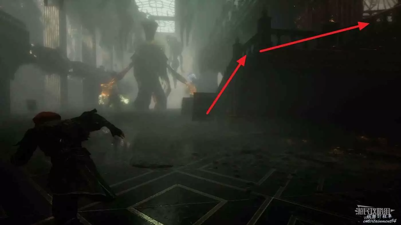 原路返回樓梯口,走中間大樓梯上去就是BOSS,將其擊敗後沿著區域走一圈即可拿完所有東西,都在很明顯的位置。