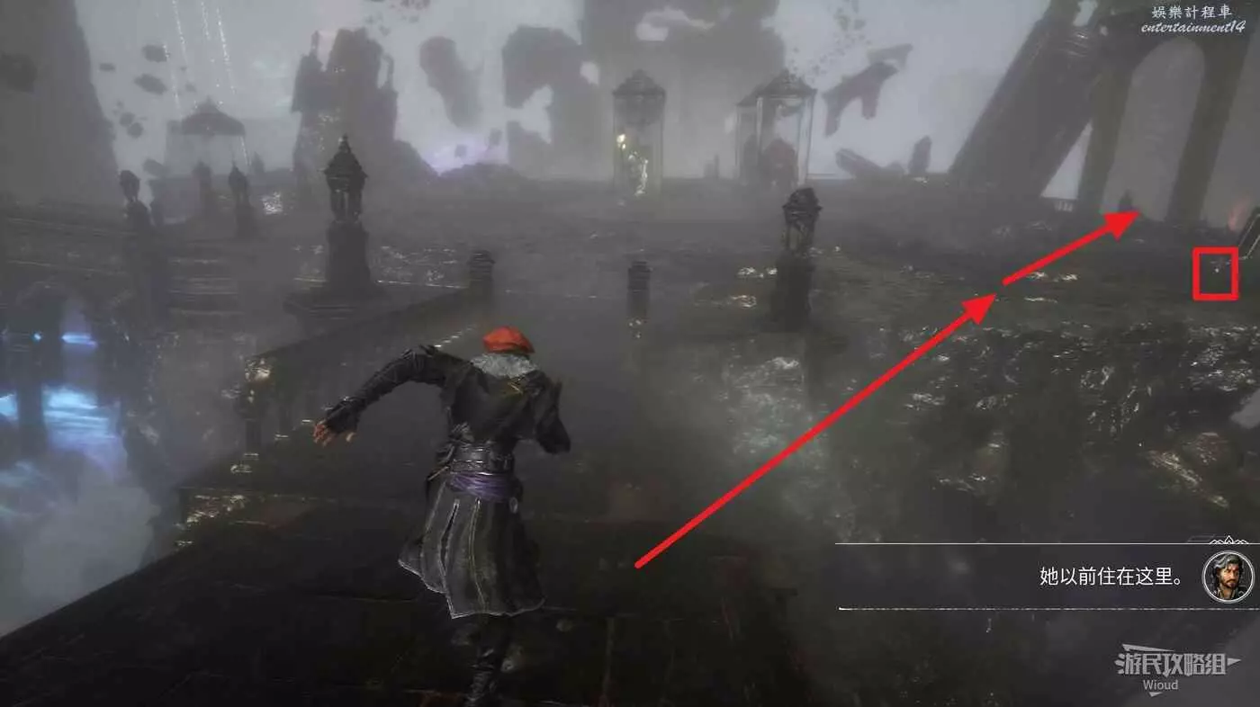 然後我們直接沿著右側箭頭所示的樓梯下去,底部可以找到一個電梯移動到另一個區域。