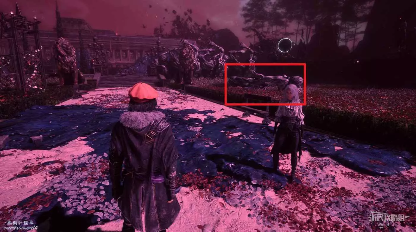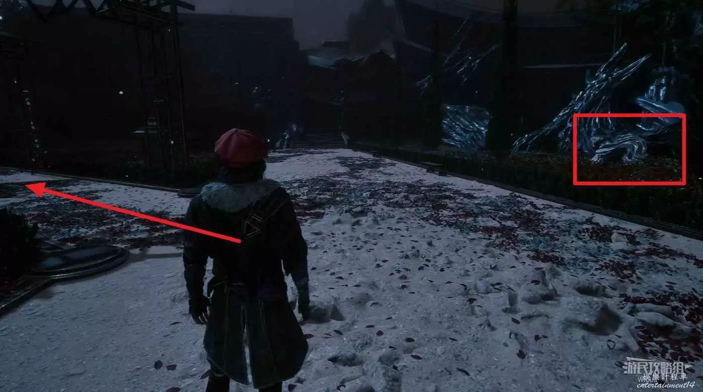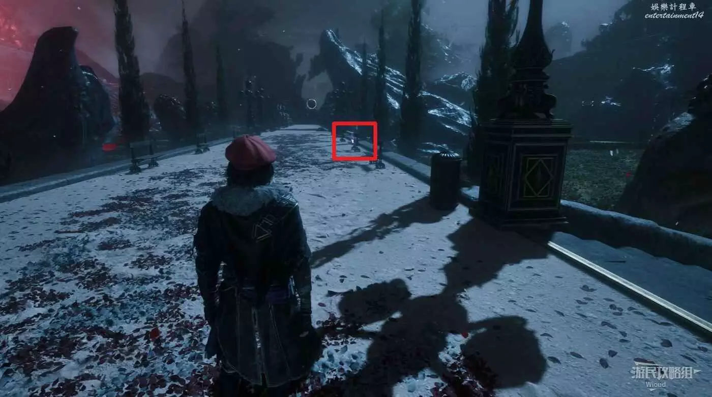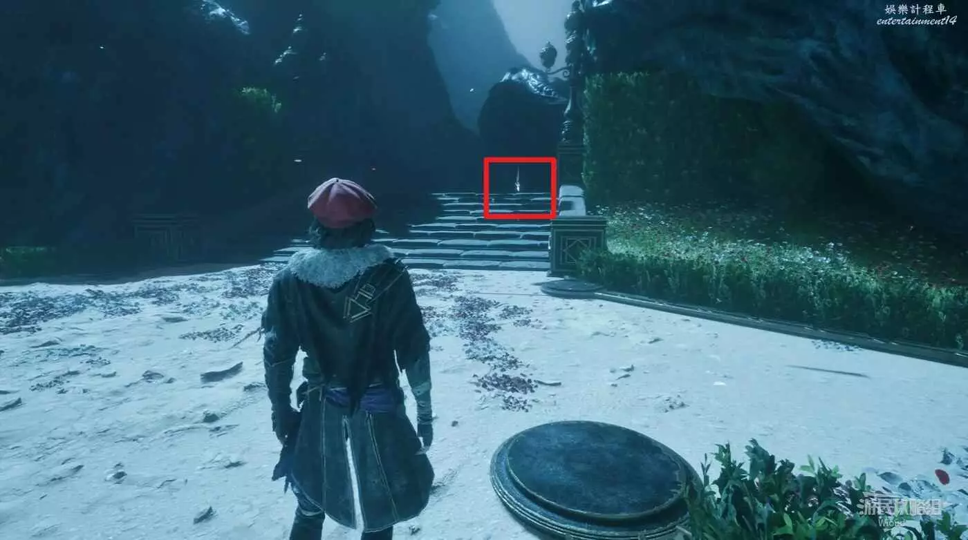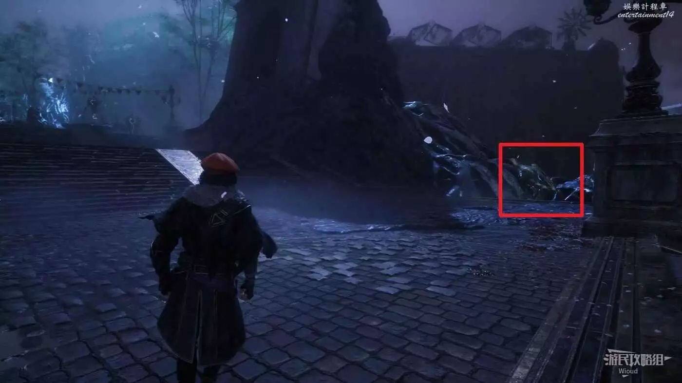 回到跳下來的位置,往左走,盡頭處可以找到一個靈光色,左側繞到中間噴泉的側後方,可在噴泉位置撿到一些道具。