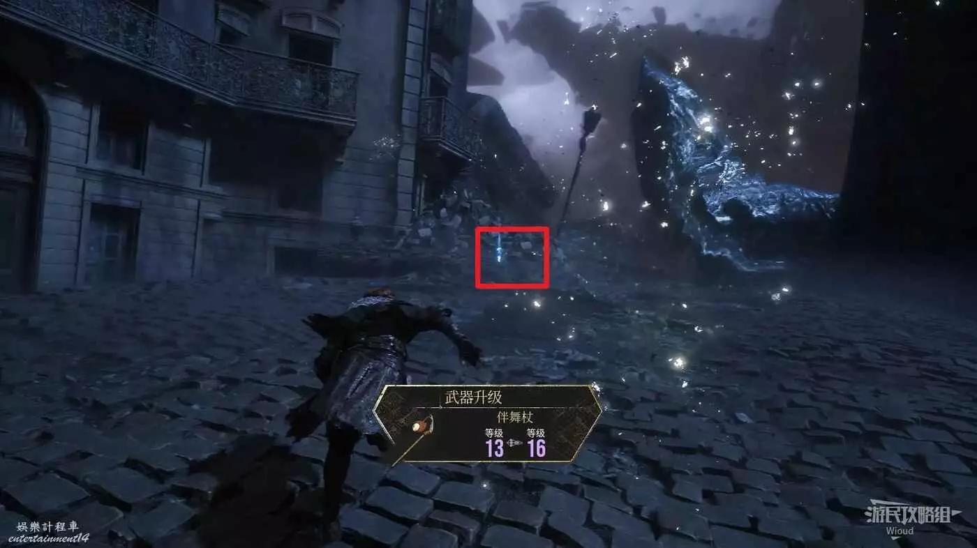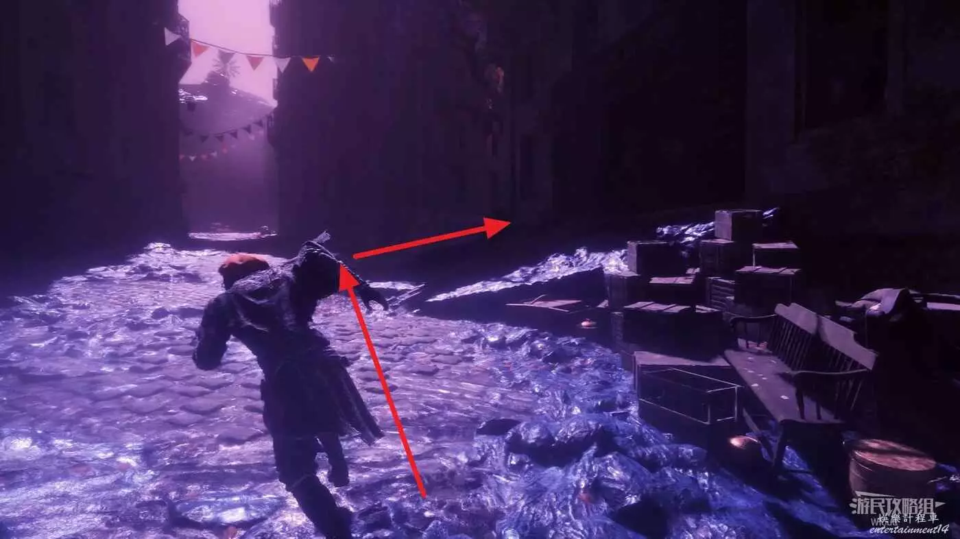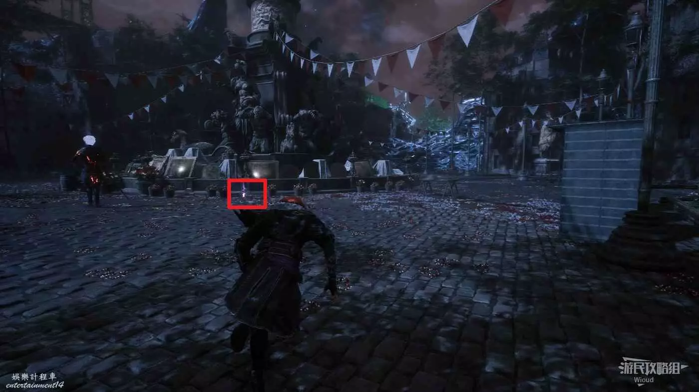 走噴泉後方主路,擊敗第一批敵人後,右側有個過道,裡面比較黑,可以撿到強化道具。