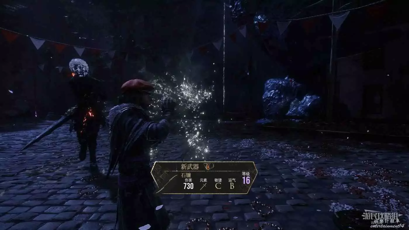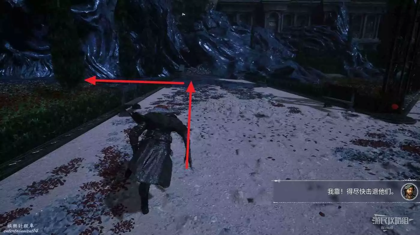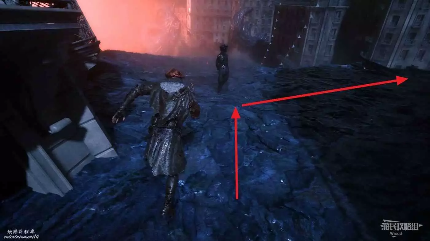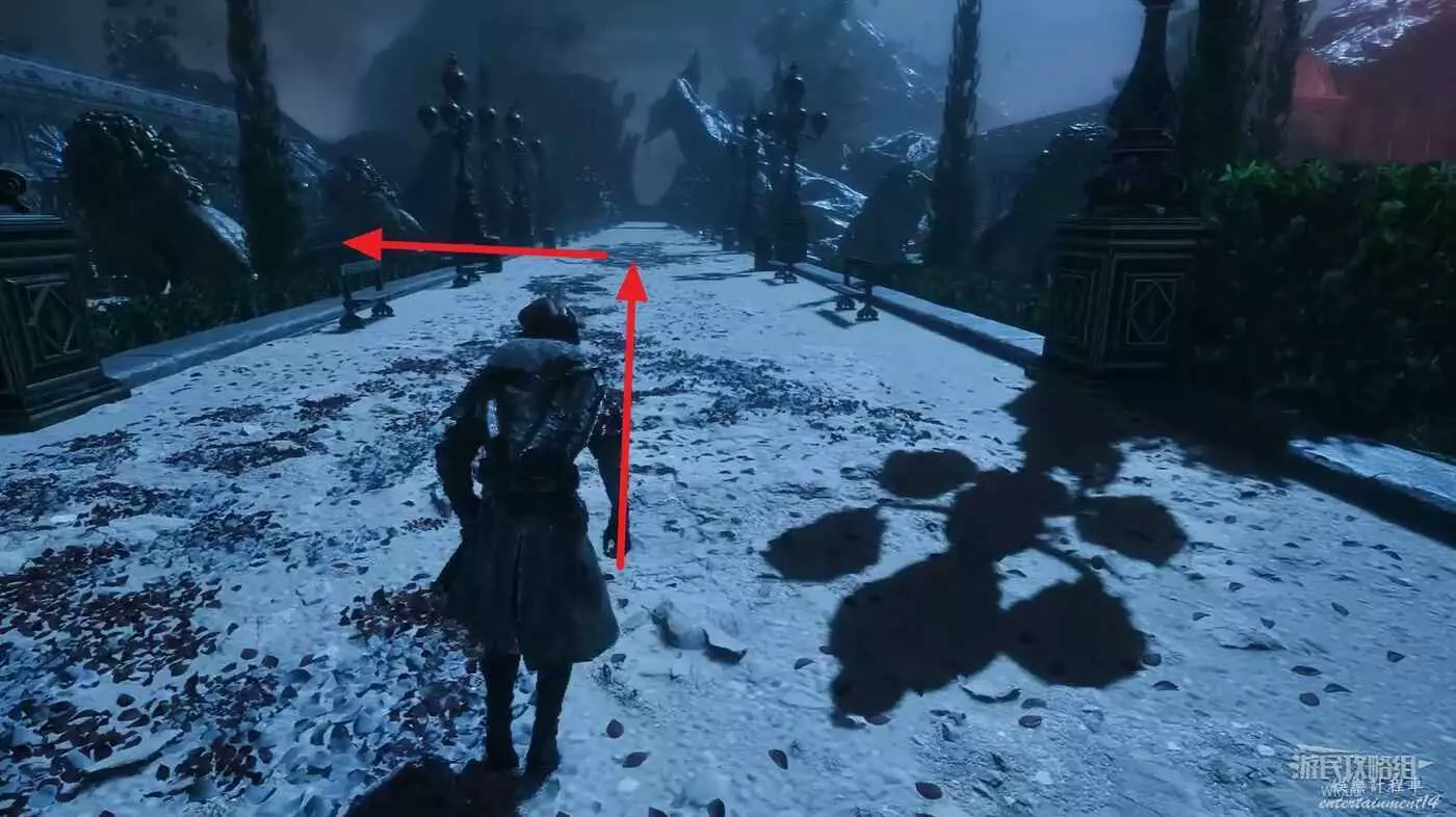 走噴泉後方主路,擊敗第一批敵人後,右側有個過道,裡面比較黑,可以撿到強化道具。