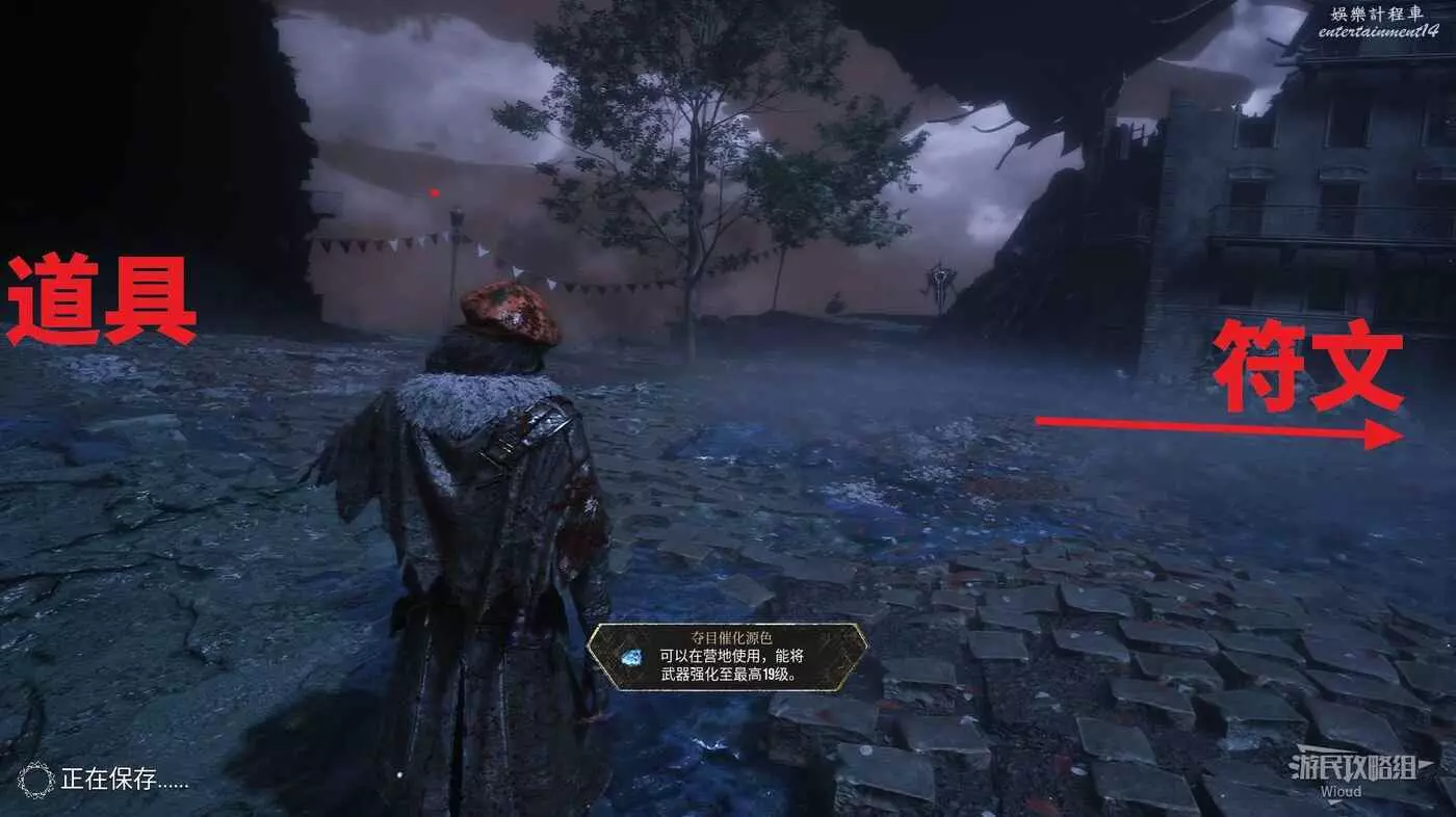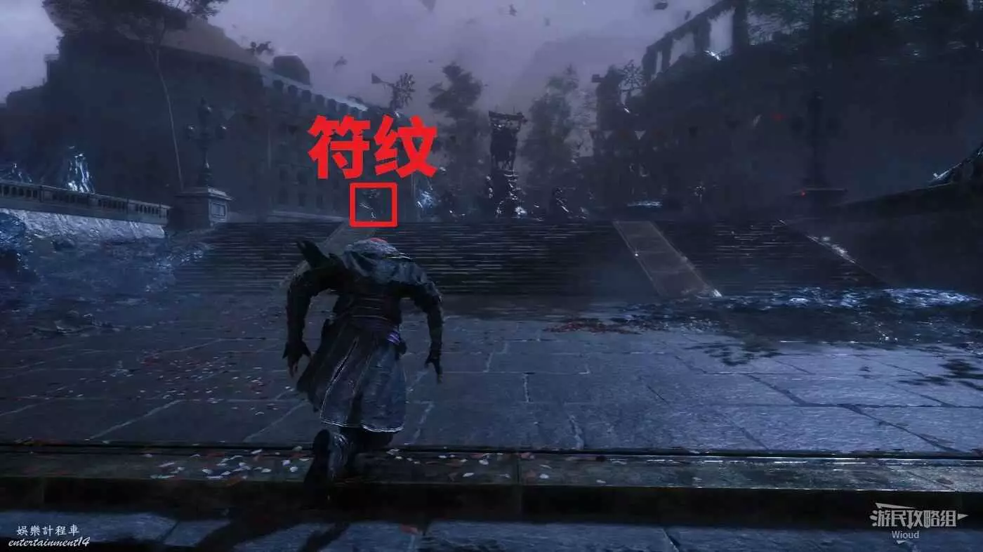 走到樓梯頂部開闊區域,擊敗左側的怪物可獲得符紋【捷徑】,怪物往左側藍色石頭的位置走可撿到一個【靈光色】,繼續往左後方繞可以找到一個強化道具,