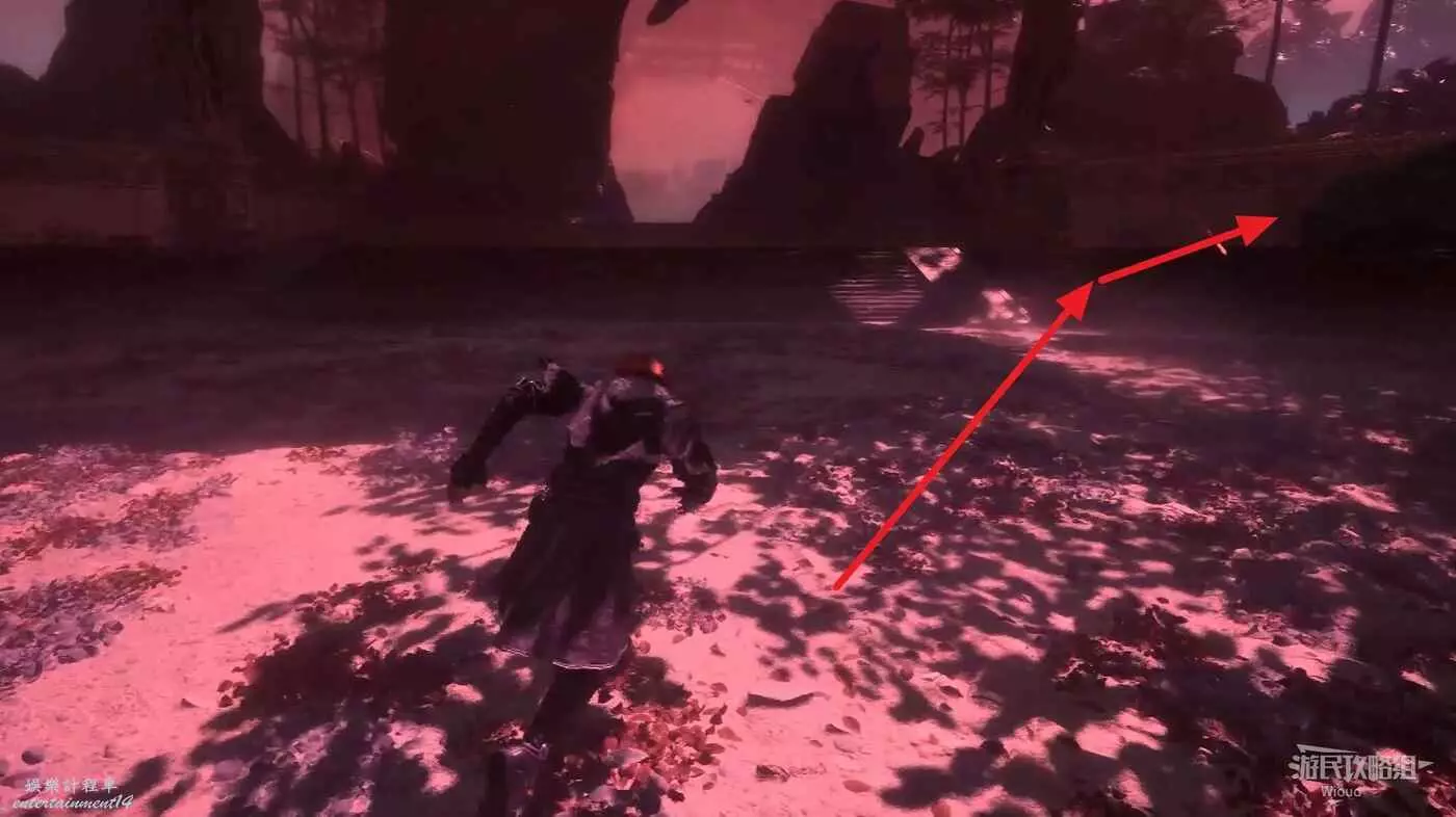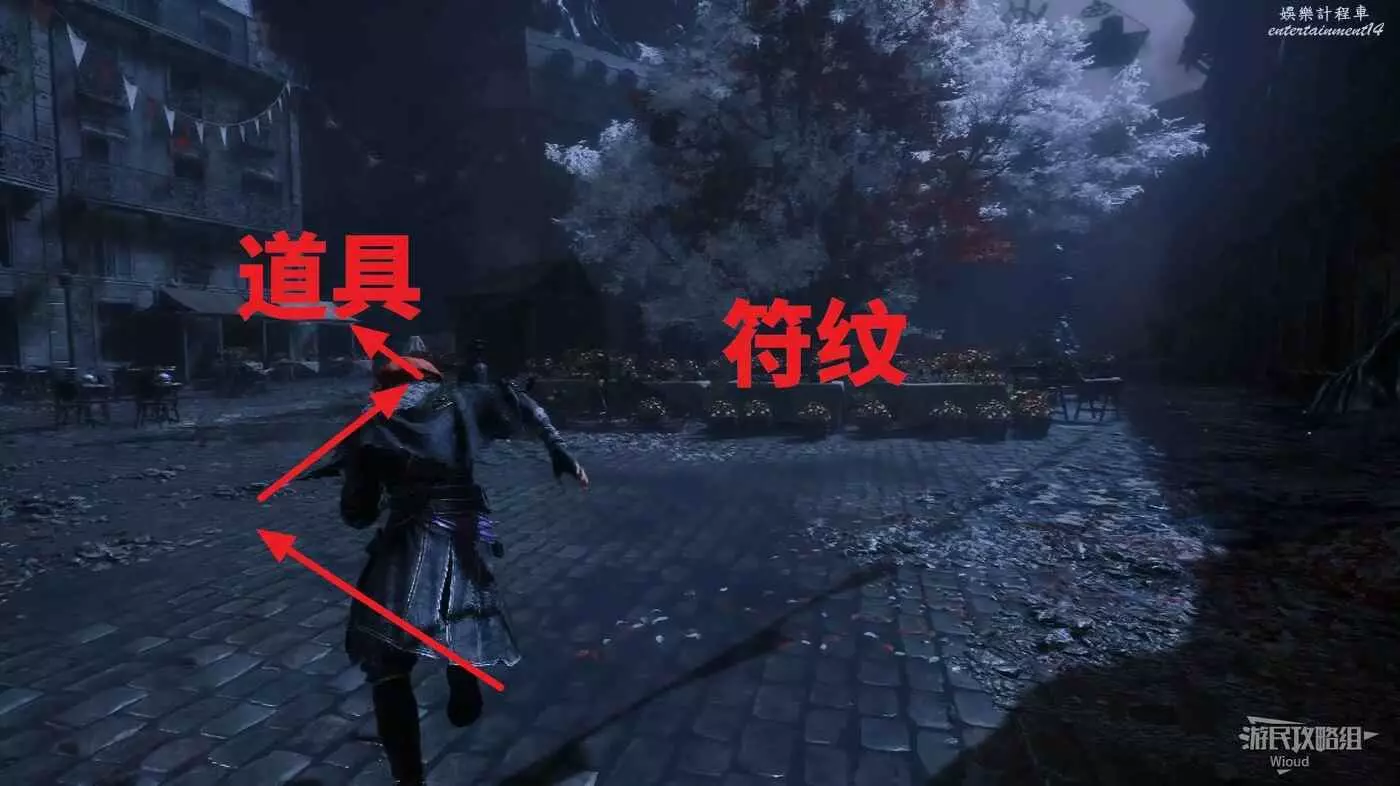 沿主路走,直到遇到黑影男孩,他右側的大樹處可撿到符紋【蓄能眩暈】,左側第一個凹口可撿到強化道具。