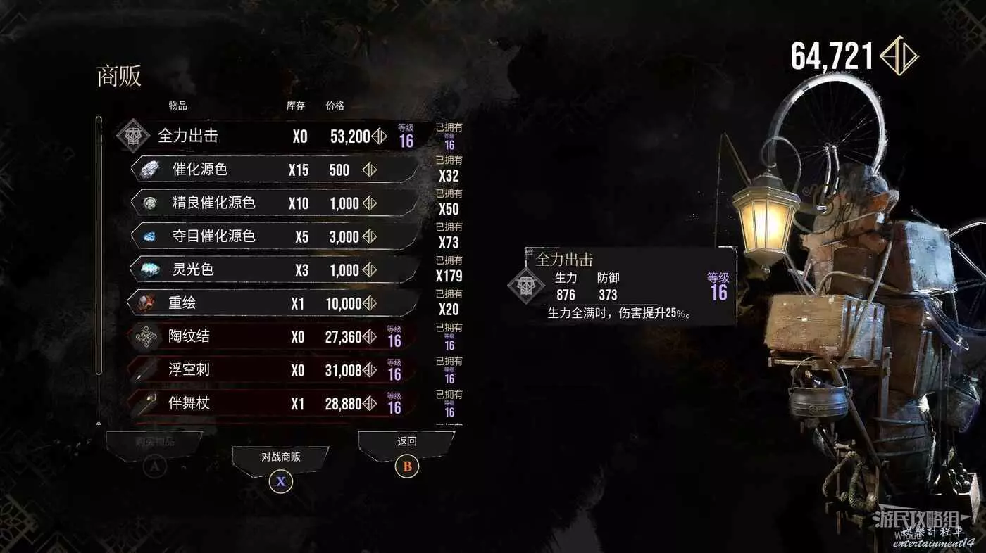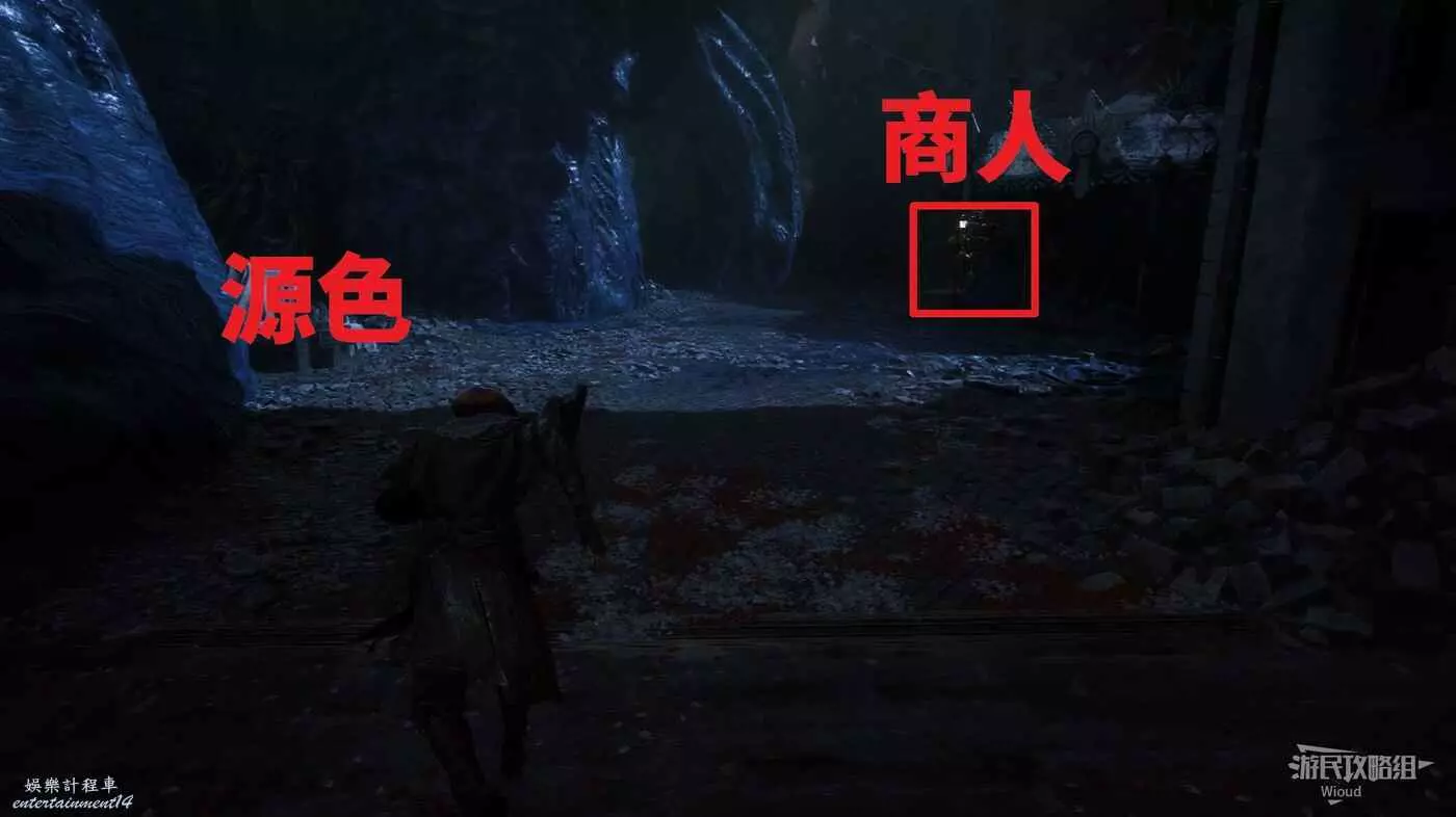 往裡走,左側蓋白布箱子的位置可撿到一些源色,前方找到一個商人,可購買符紋【全力出擊】,武器【陶文結】、【浮空刺】。