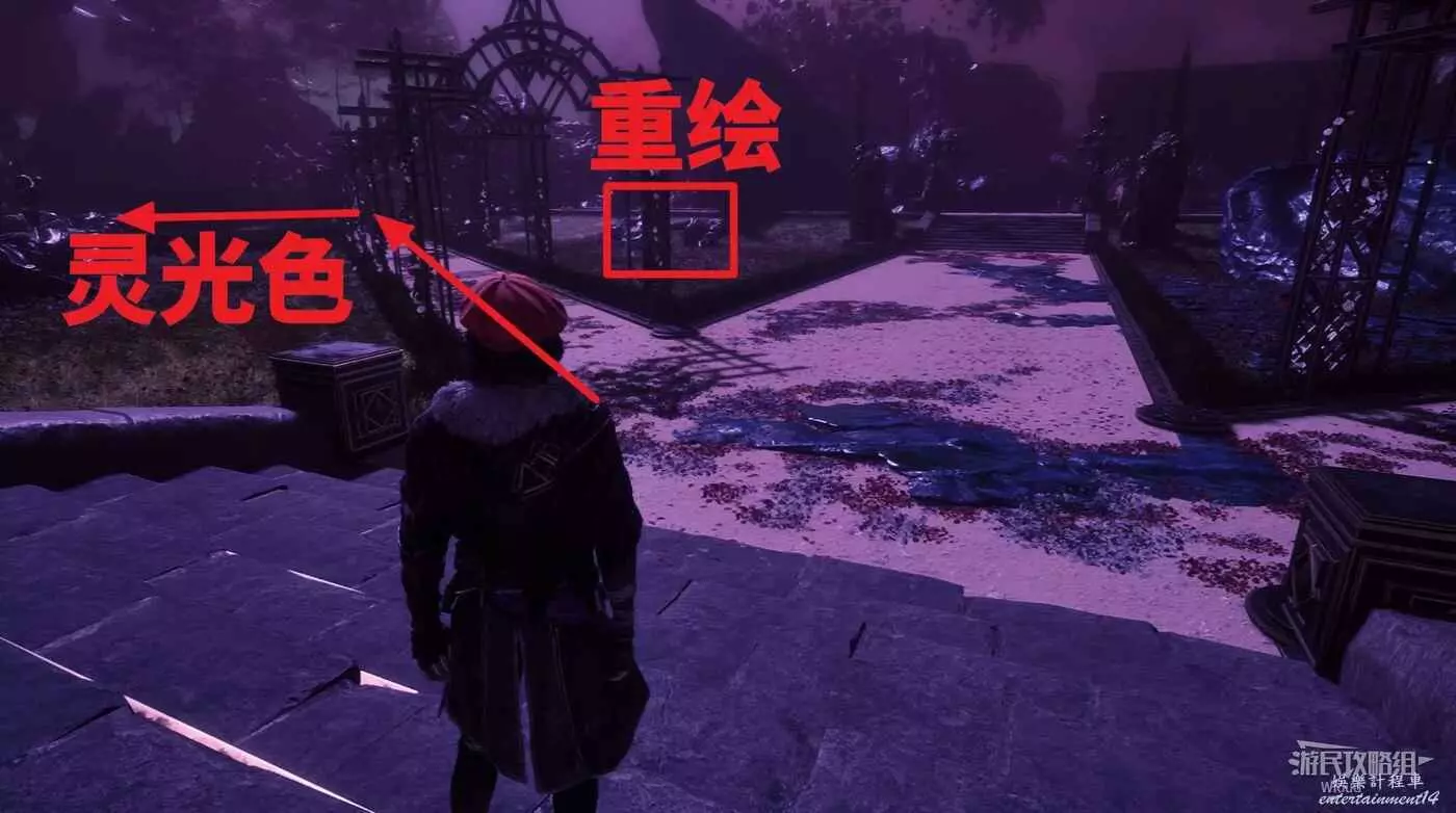 符紋位置轉頭,下圖紅框所示位置可撿到一個【重繪】,沿著左側的箭頭所示路線往左走,樓梯處可撿到一個【靈光色】。