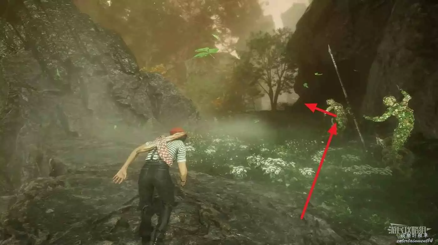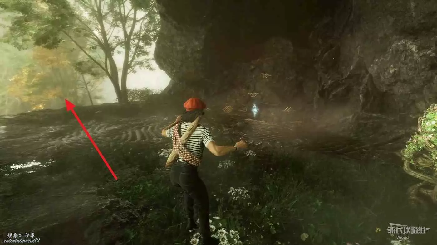 回到旗幟位置,前方開闊區域有著明顯的岔路,先往左走,沿路直走到盡頭可找到本地圖的【默偶】。