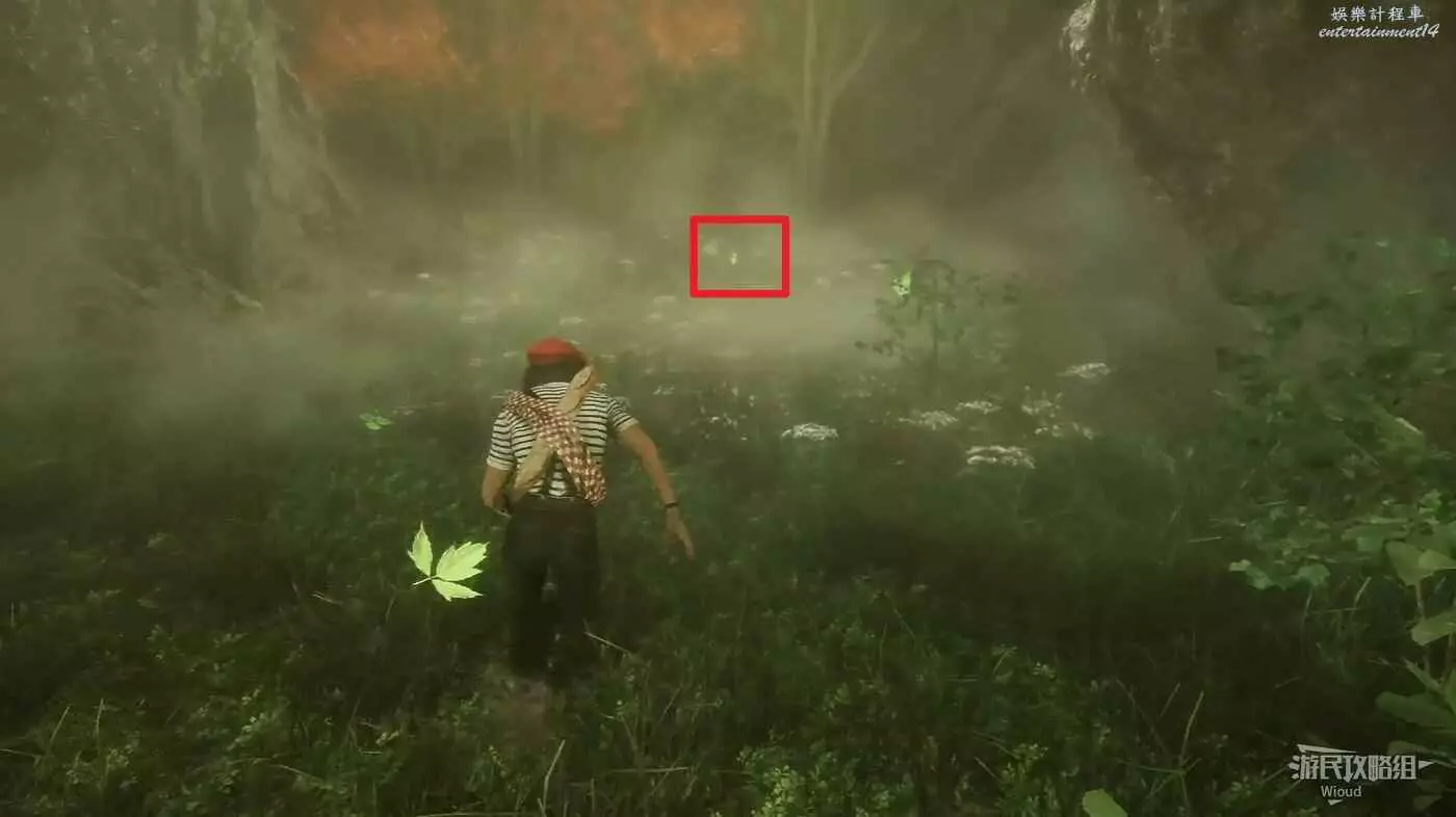 最後回到旗幟位置往岔路右側走,不遠處右側會出現一大塊空地,這時立刻往右走,盡頭可找到一個紫色道具點。