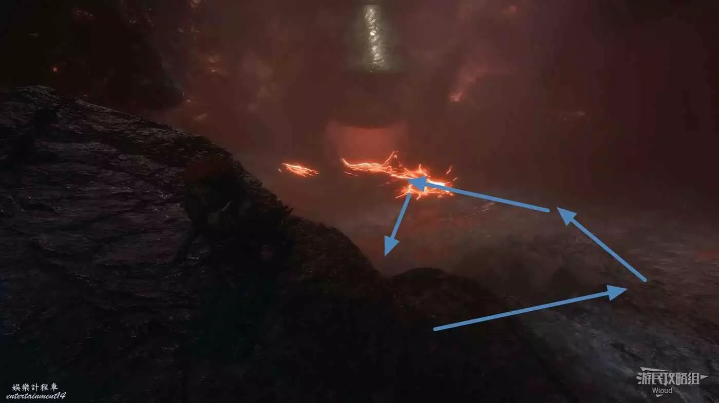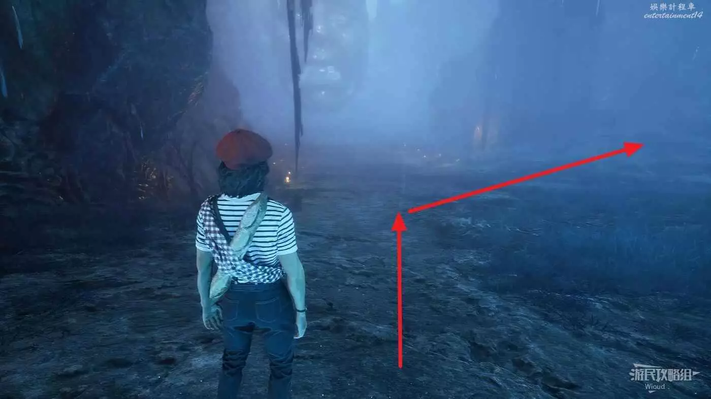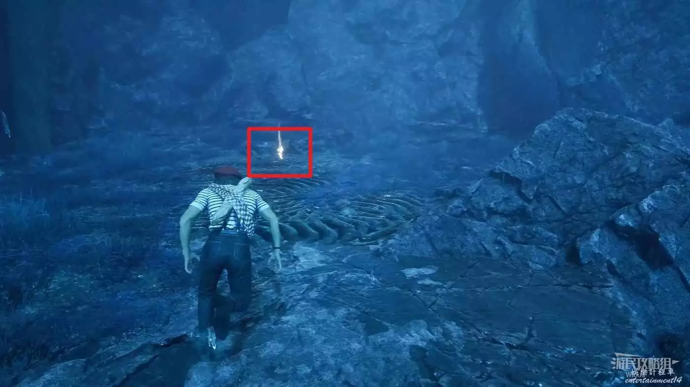 原路返回旗幟位置,貼著右牆走中間的主路,直到右側出現一大塊開闊區域,進入右側散發藍光的洞穴內。