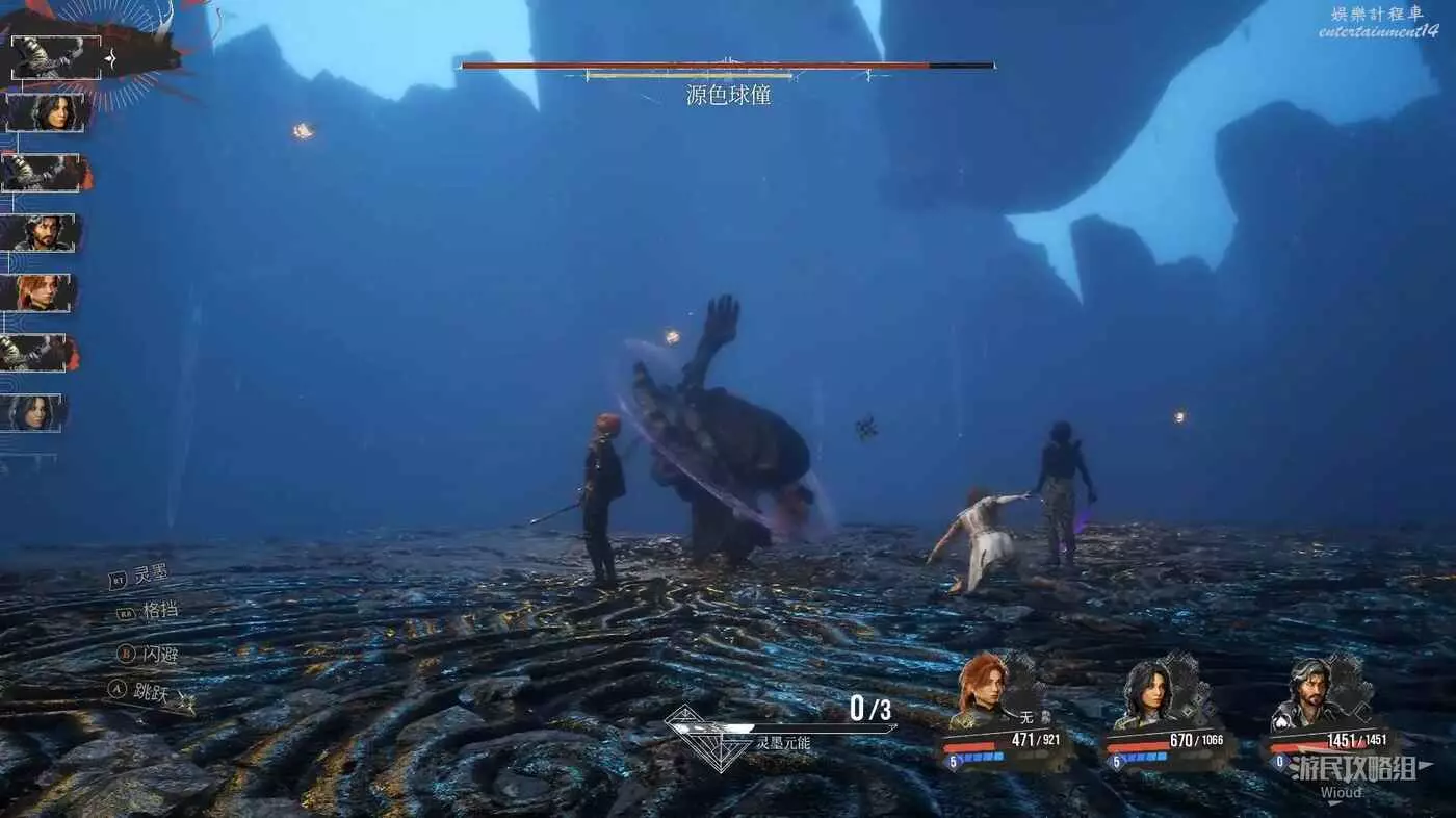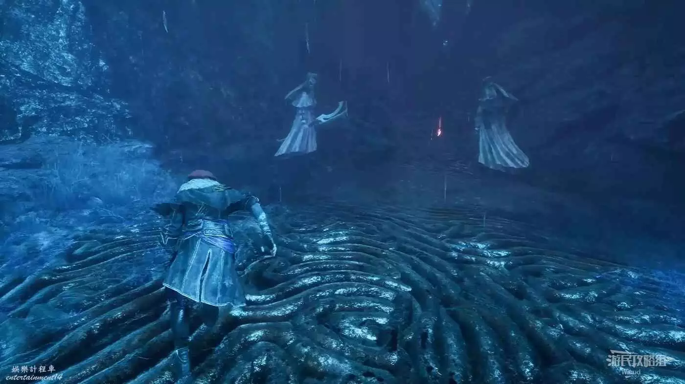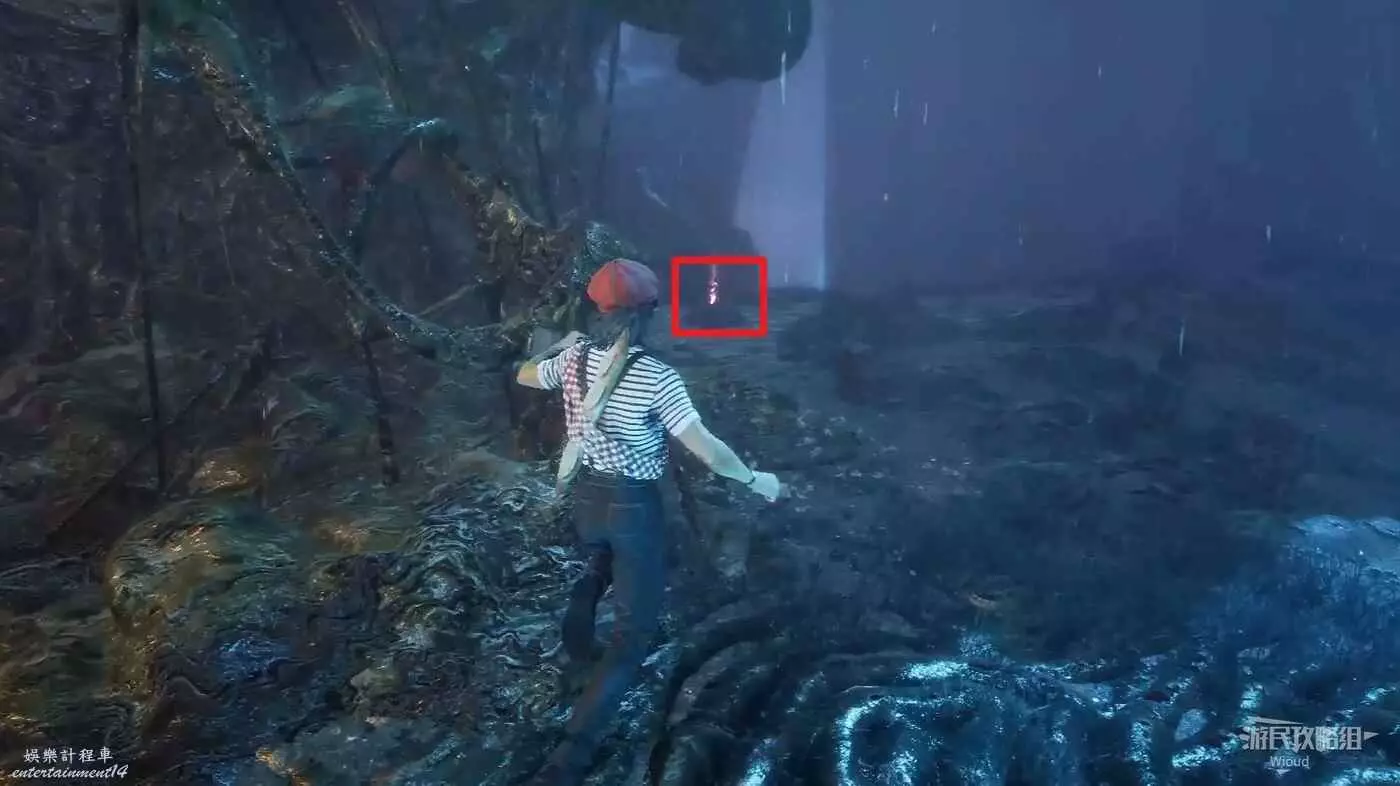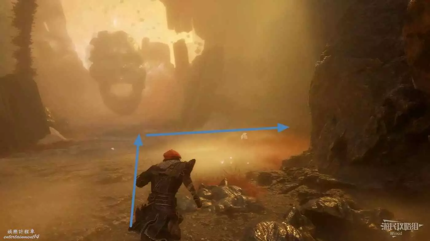 原路返回旗幟位置,貼著右牆走中間的主路,直到右側出現一大塊開闊區域,進入右側散發藍光的洞穴內。