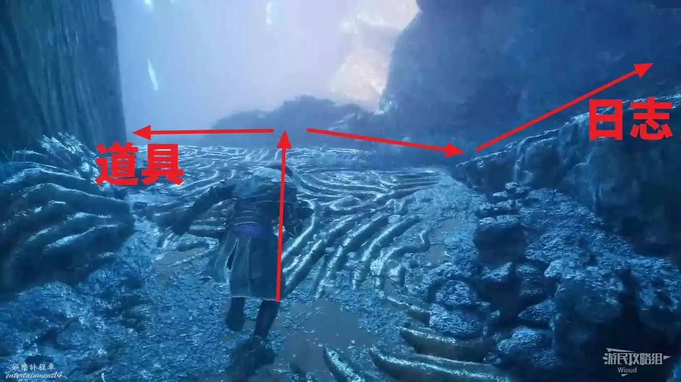 日誌位置跟著箭頭直走跳下去,右前方道具點可拿到不少源色。