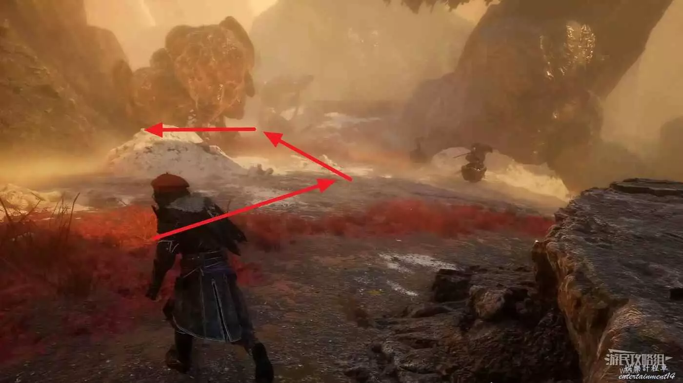 穿過開頭面具前,沿著下圖箭頭往左後繞一下,有源色可拿。
