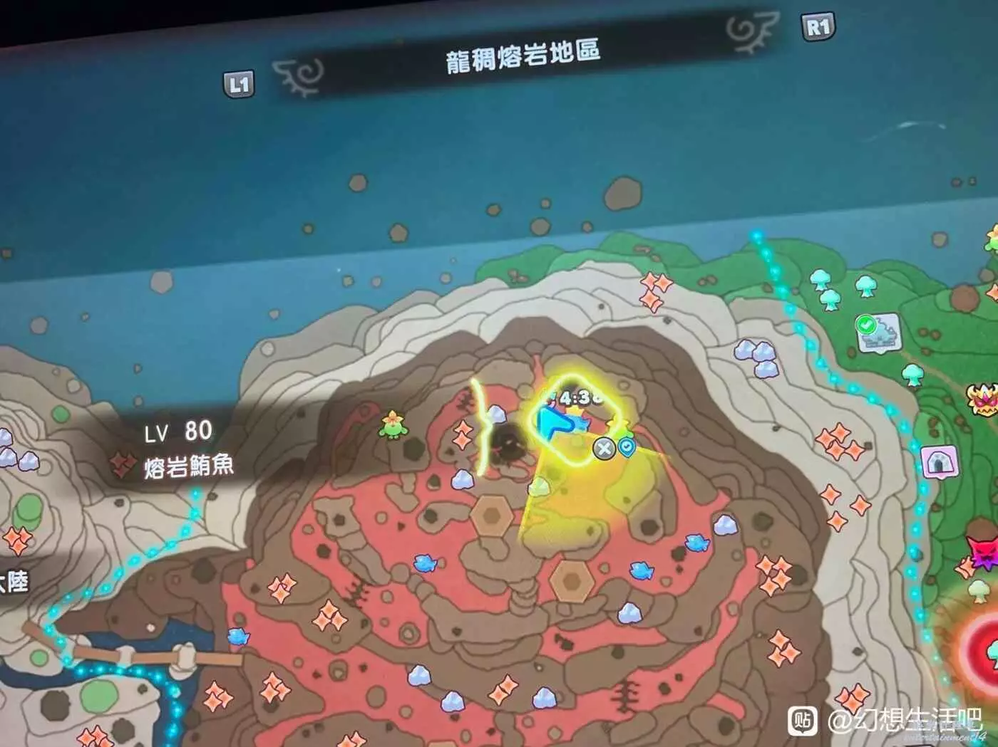 火山熔岩地帶北端,有一條熔岩鮪魚,掉落熔岩魚鰭