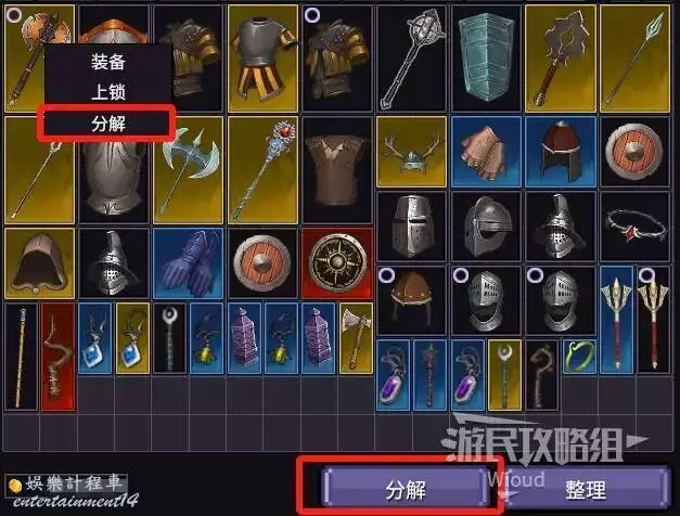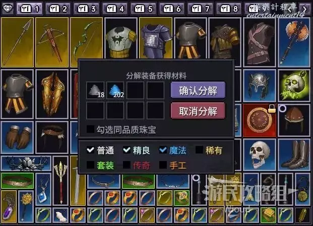 倉庫分解單個或批量分解某個品質的裝備可獲得大量材料。