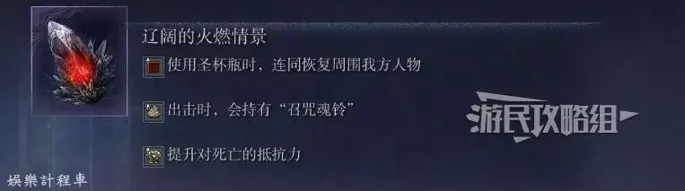 使用血瓶時附近隊友同步恢復生命值,此效果可以讓全員都成為奶媽,顯著延長血瓶的續航能力,如果散人均裝備此遺物,在比較持久的BOSS戰中生存率將大幅提升。