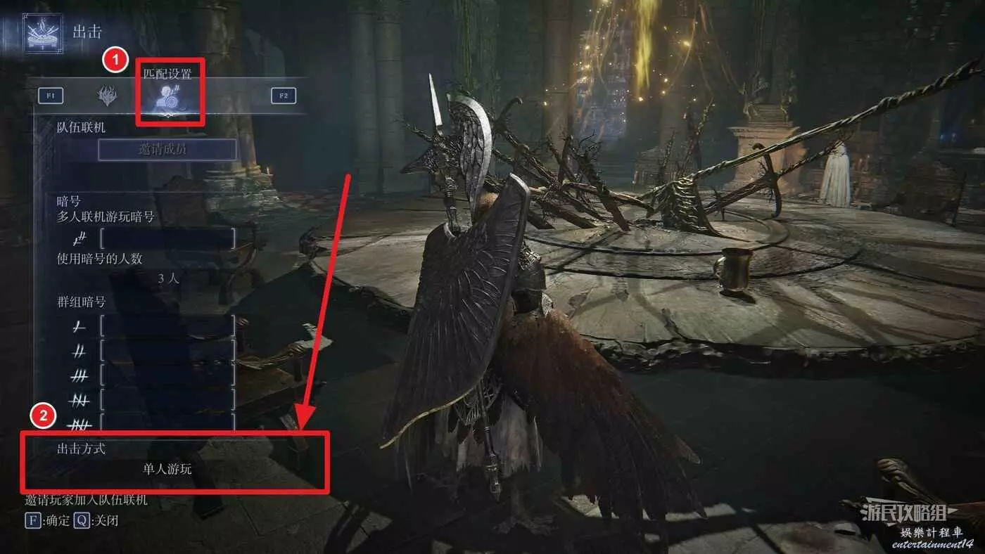 艾爾登法環 黑夜君臨 單人遊玩方法 30 5 月 2025-05-30 廣告 作者:瑞破受氣包 來源:遊民星空 完成教學後(ESC選項功能表中可以直接結束教學)進入圓桌廳堂,與圓桌互動【出擊】,在出擊介面切換【匹配設置】標籤頁,在最下方選擇【單人遊玩】即可。