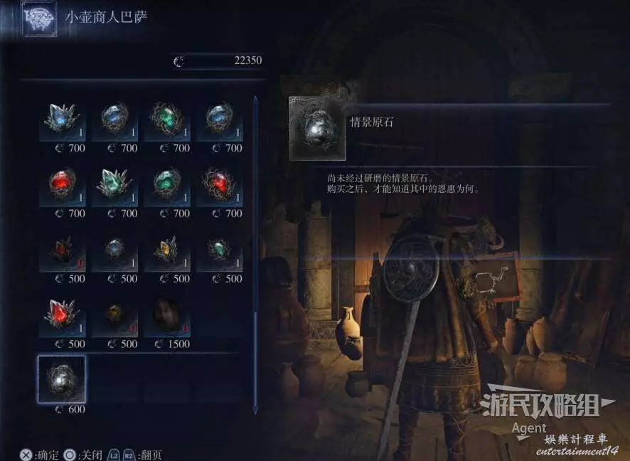 在小壺商人巴薩處,用暗痕可購買杯盅、表情動作、遺物(隨著你遊戲深入這裡可購買的道具會逐漸增加)。購買情景原石則可隨機獲得遺物。