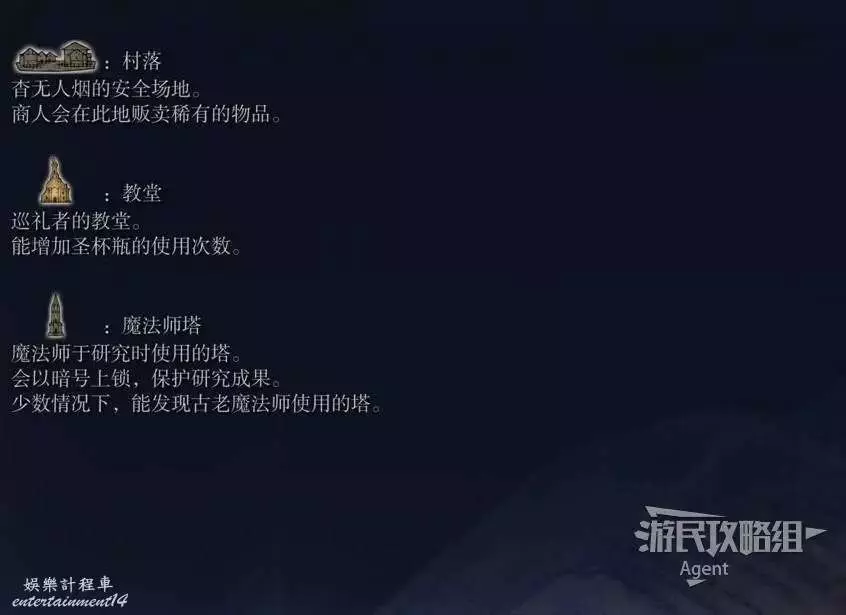 村落:有商人,可用盧恩購買道具。比如復活幣(可能單刷時才有)和背包擴容等。其他地方也有機會可以遇到商人。