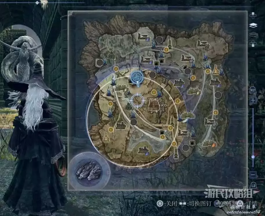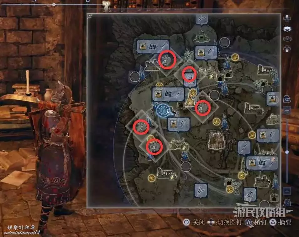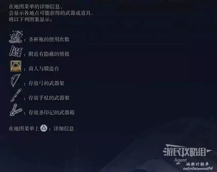 查看地圖詳情,各個地點上會標註可獲得的武器種類,或者商人、血瓶、糞金龜地圖。