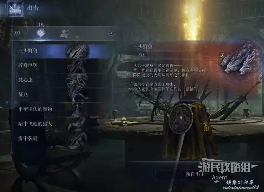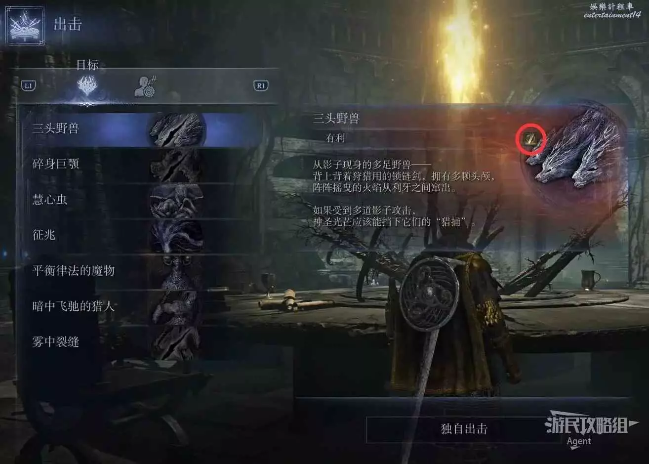 出擊前注意,BOSS弱點的攻擊屬性或異常狀態,顯示在BOSS頭像上的小方塊上,比如三頭狗的弱點是聖屬性攻擊。