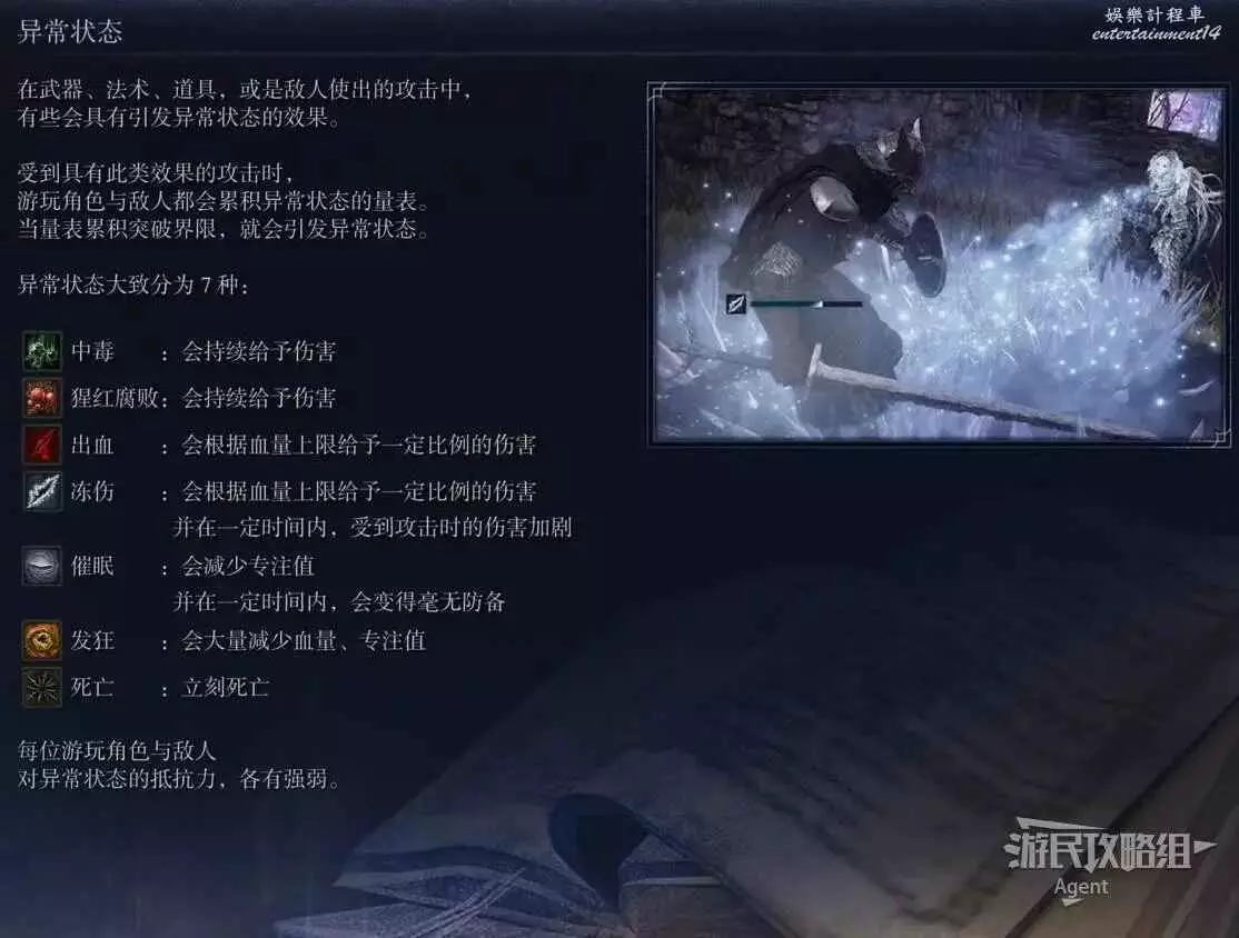 異常狀態有:中毒、猩紅腐敗、出血、凍傷、催眠、發狂、死亡。