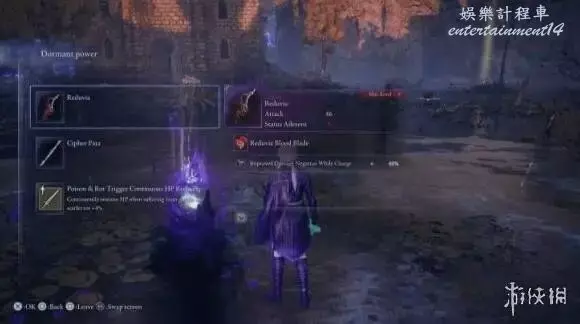 在城堡外懸崖處與兩個商人交談,購買藍色鍛造石,將起始武器升級至紫色(使用藍色+紫色鍛造石)。