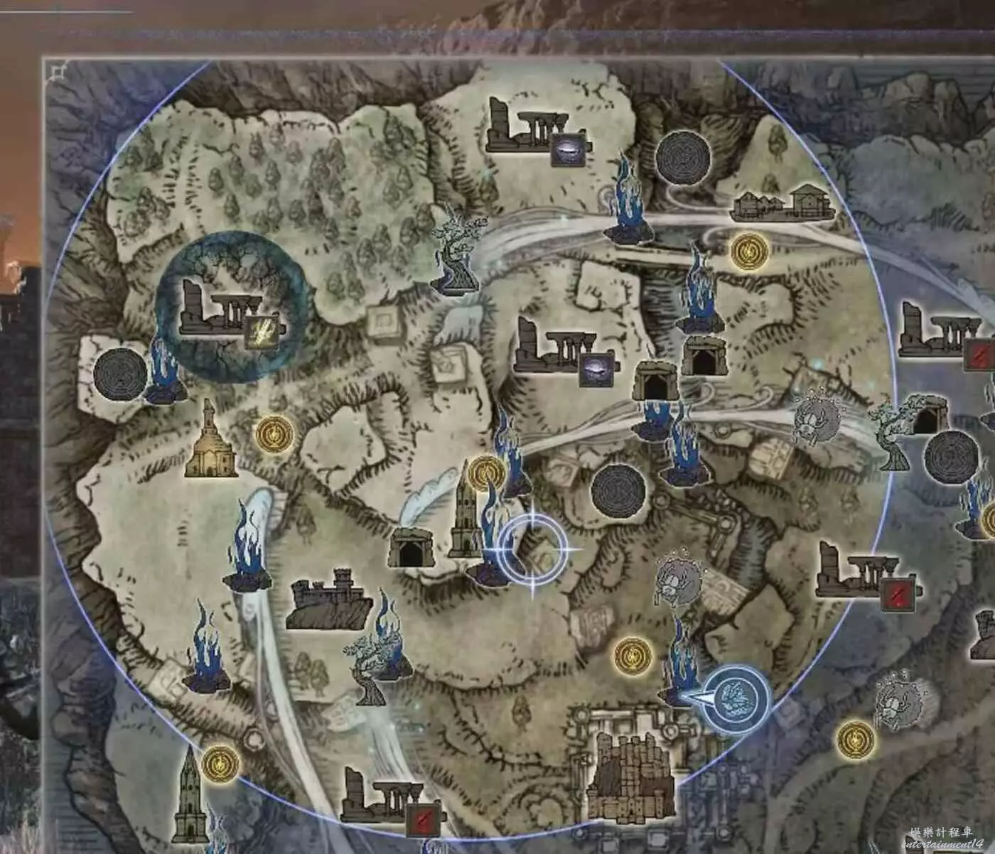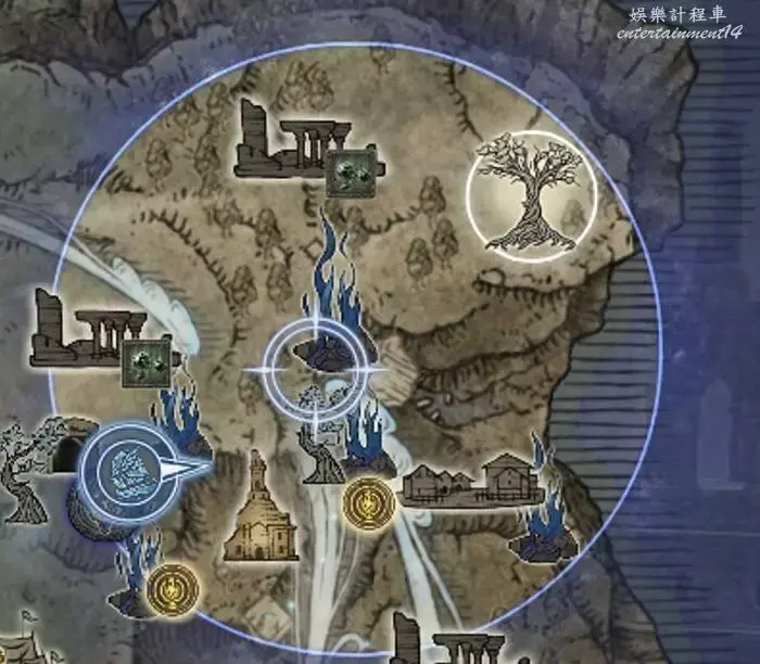 第二次縮圈準備打夜晚boss,這時候應該有7級可以拿紫色武器了,往白色樹標記那裡走,路上要是有遺跡這種據點可以選擇打一打,特別是調香師,者鮮血貴族這種路邊一條,第二天打遺跡性價比已經不高了,縮圈路上要是有賜福可以淋點雨多貪一會,走過賜福就可以回血補瓶。
