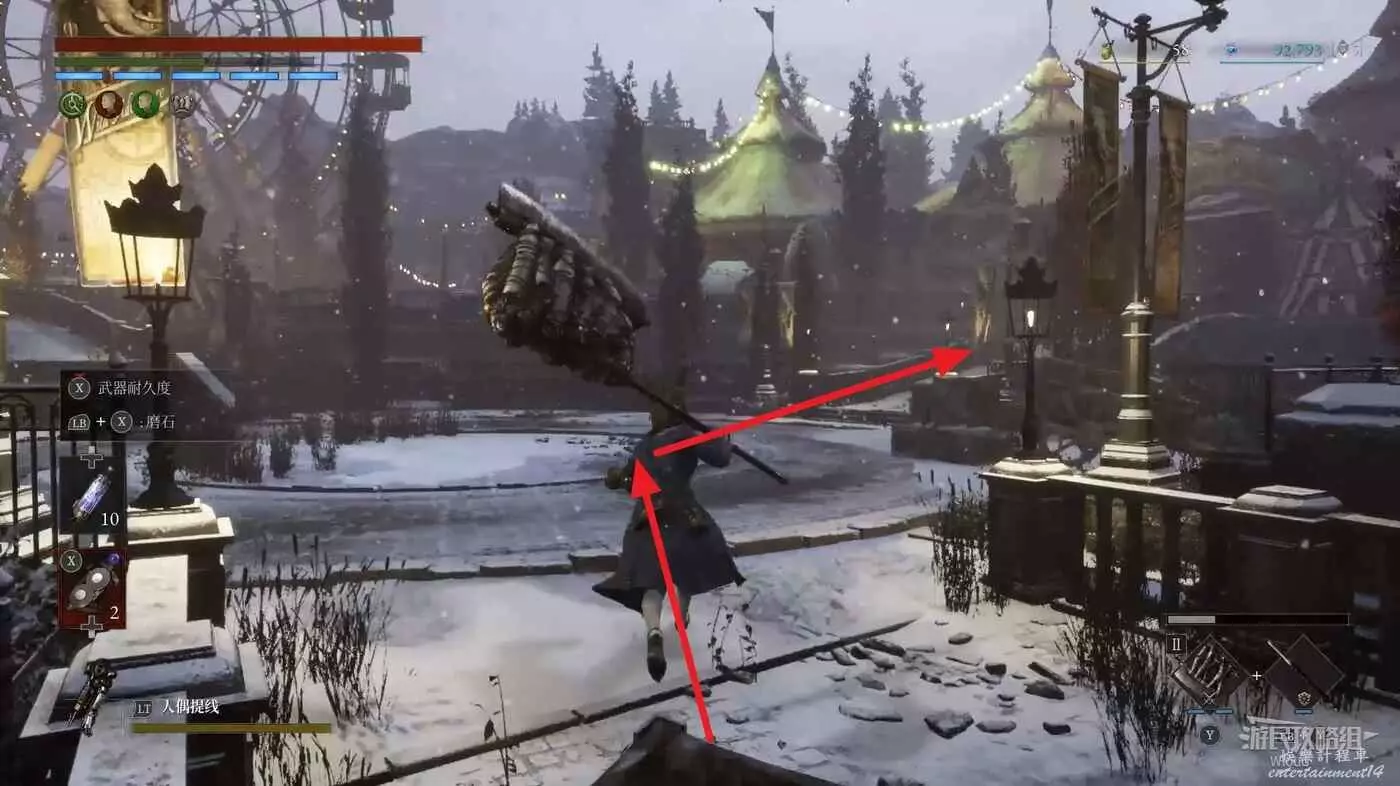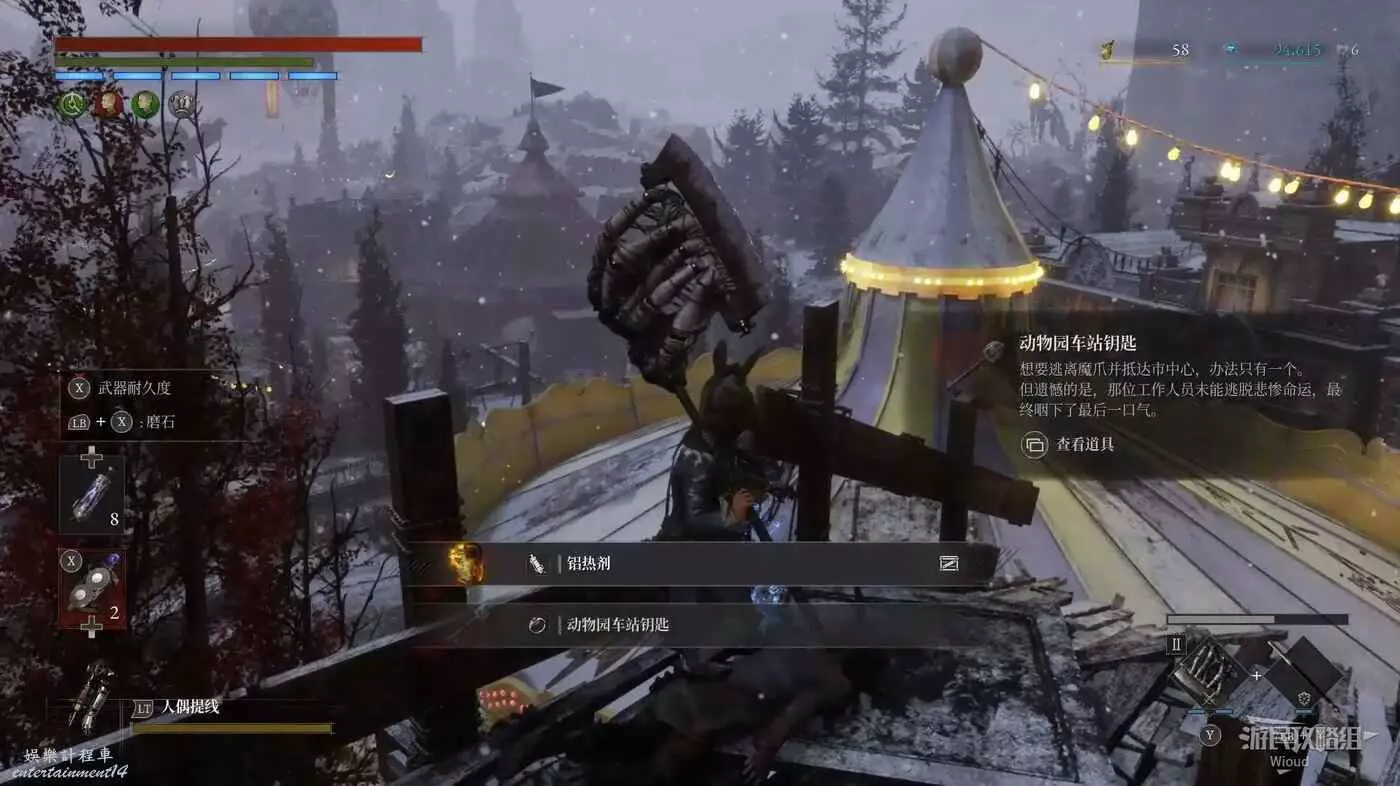 此處可以撿到【動物園車站鑰匙】,然後跳到旋轉木馬頂棚上,這裡有一個缺口跳到旋轉木馬裡面。