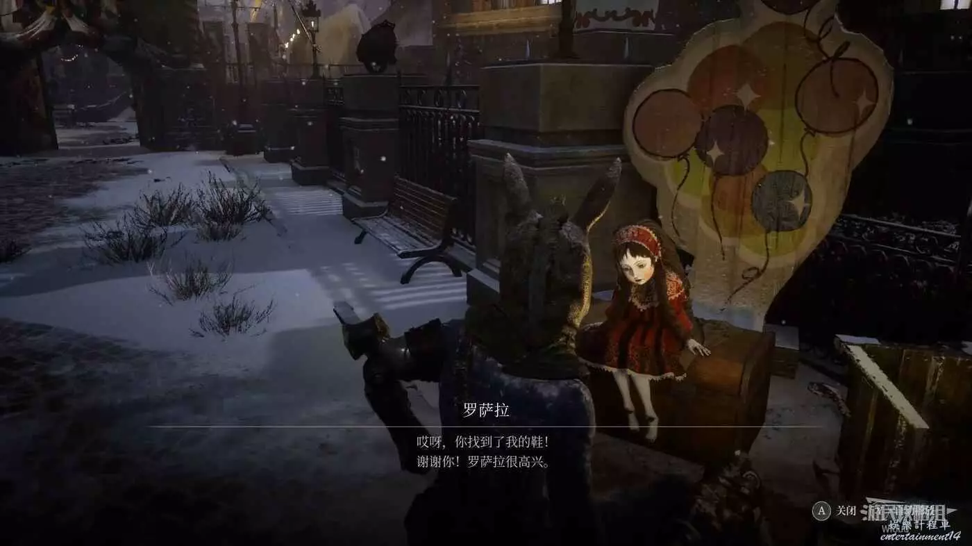 從缺口離開旋轉木馬,回到篝火【狂歡花園】處將剛才拿到的玫瑰鞋交給【羅薩拉】,對話完畢獲得收藏品【羅薩拉的寶物:畫作碎片】與唱片【Lisrim】。