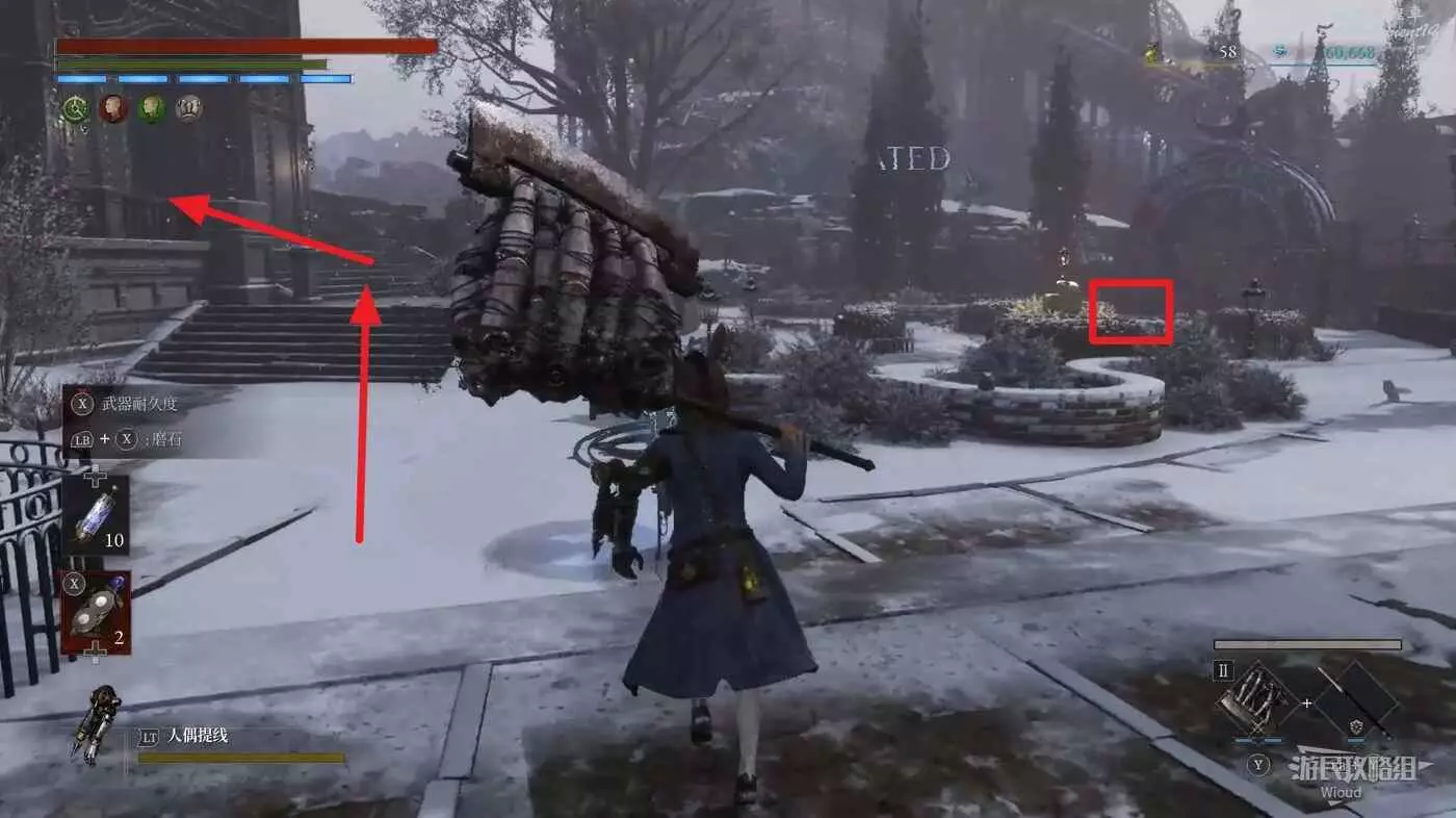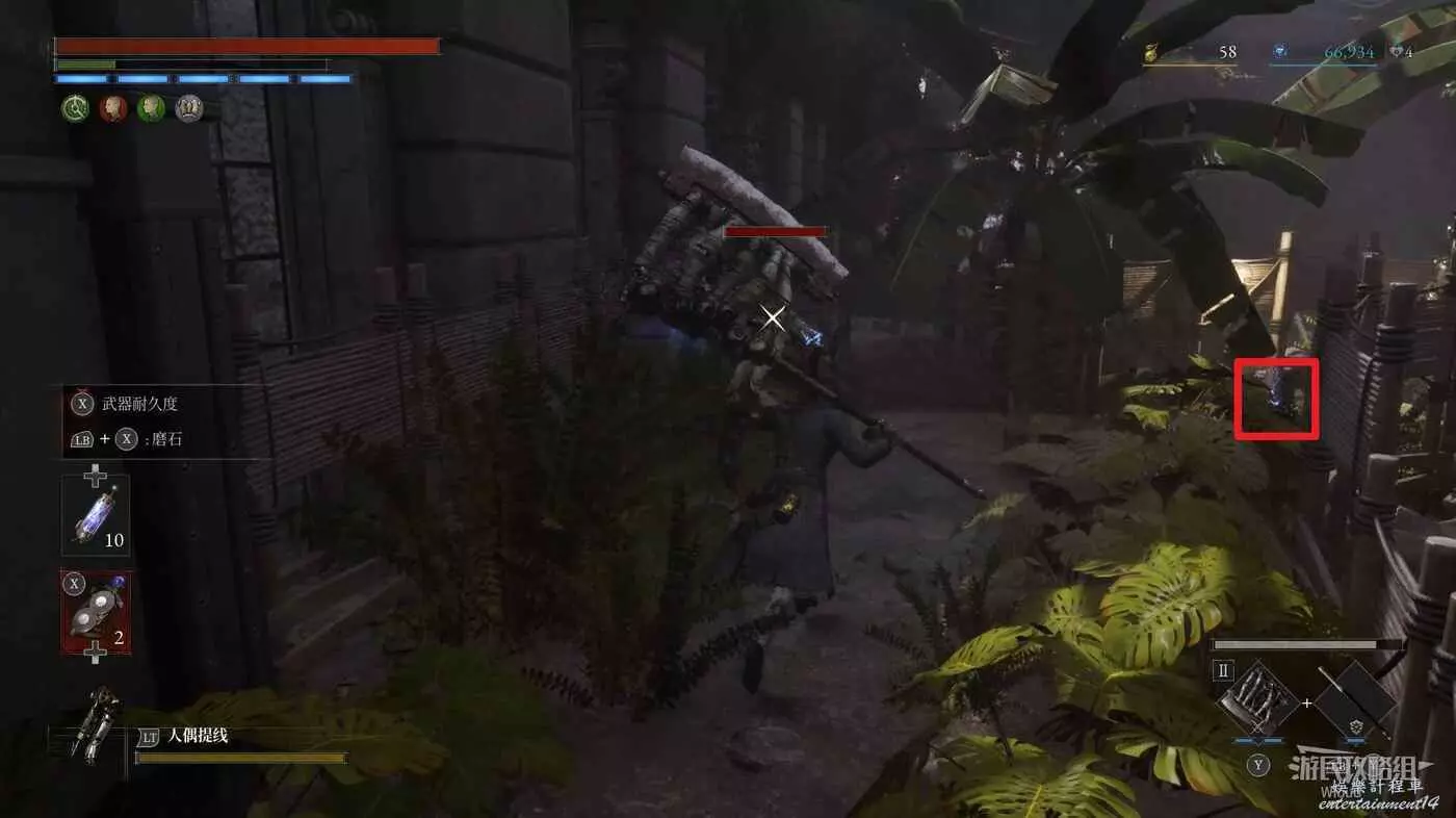 篝火右前方被障礙物擋住的大門前屍體處可撿到一個【屬性淨化安瓶】,打開左側建築大門進入花園內部。