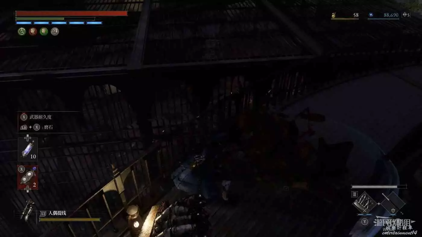 回到煉金師屍體處,走左邊往上的主路,盡頭開啟之前入口左側那個緊閉的大門,然後進入左側的房間內。