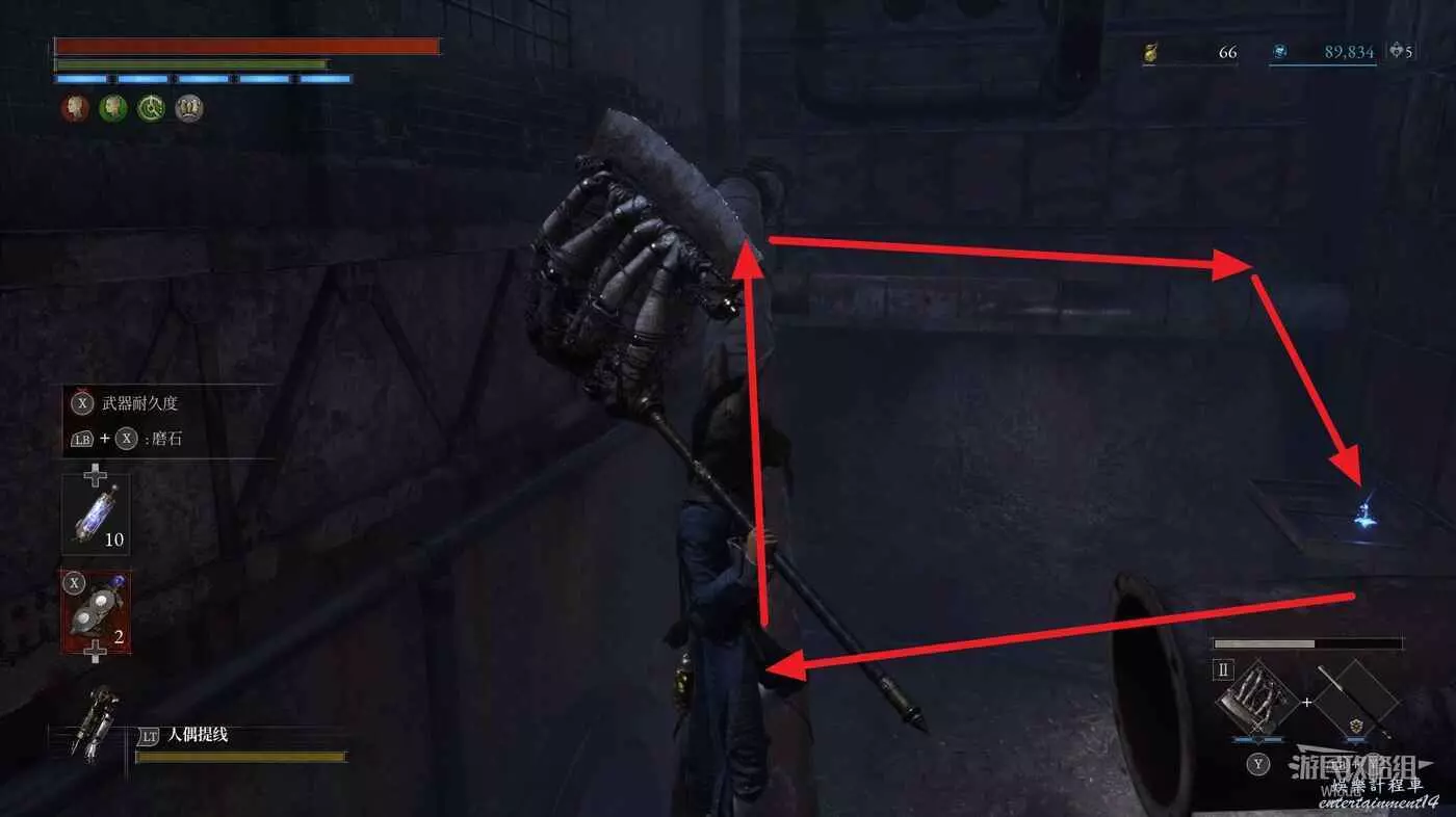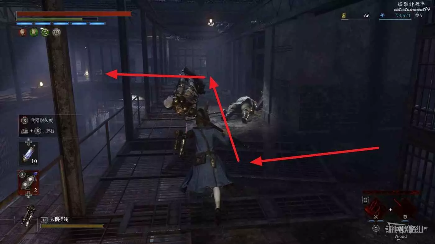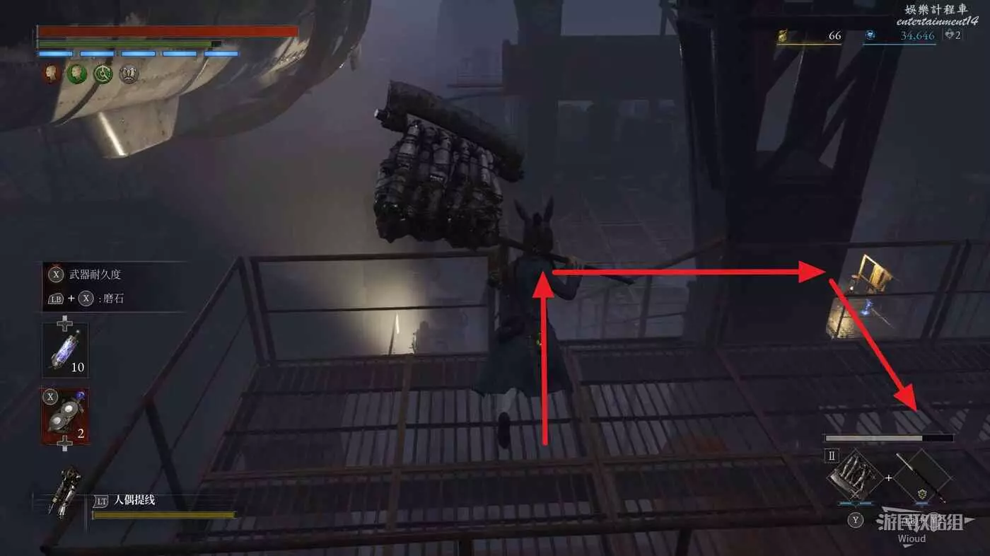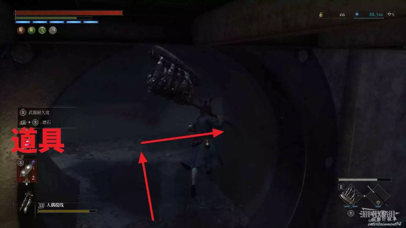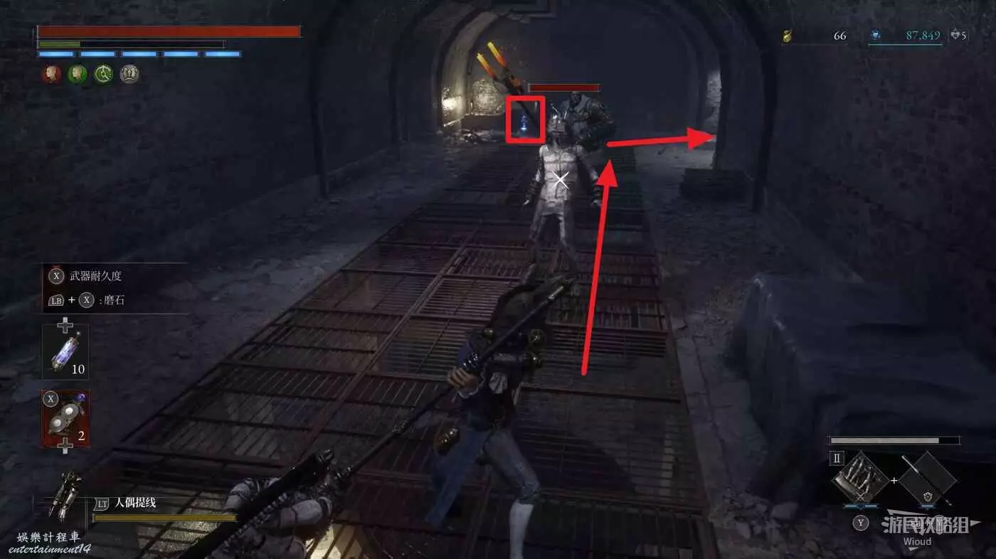 從【皮斯特裡斯海港】篝火開始,篝火處往下走到一個鋼筋橫樑處撿個道具,往下走,再次遇到推人的敵人。
