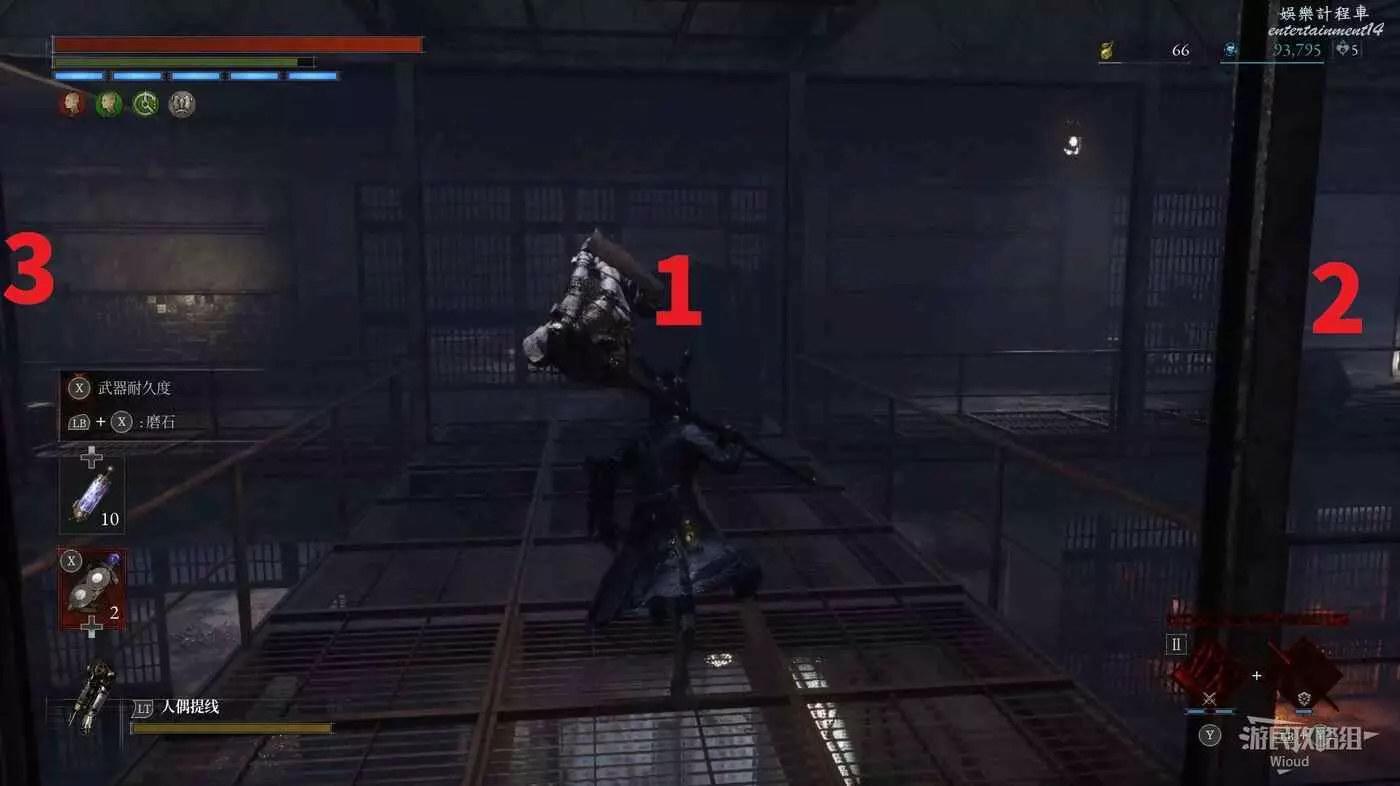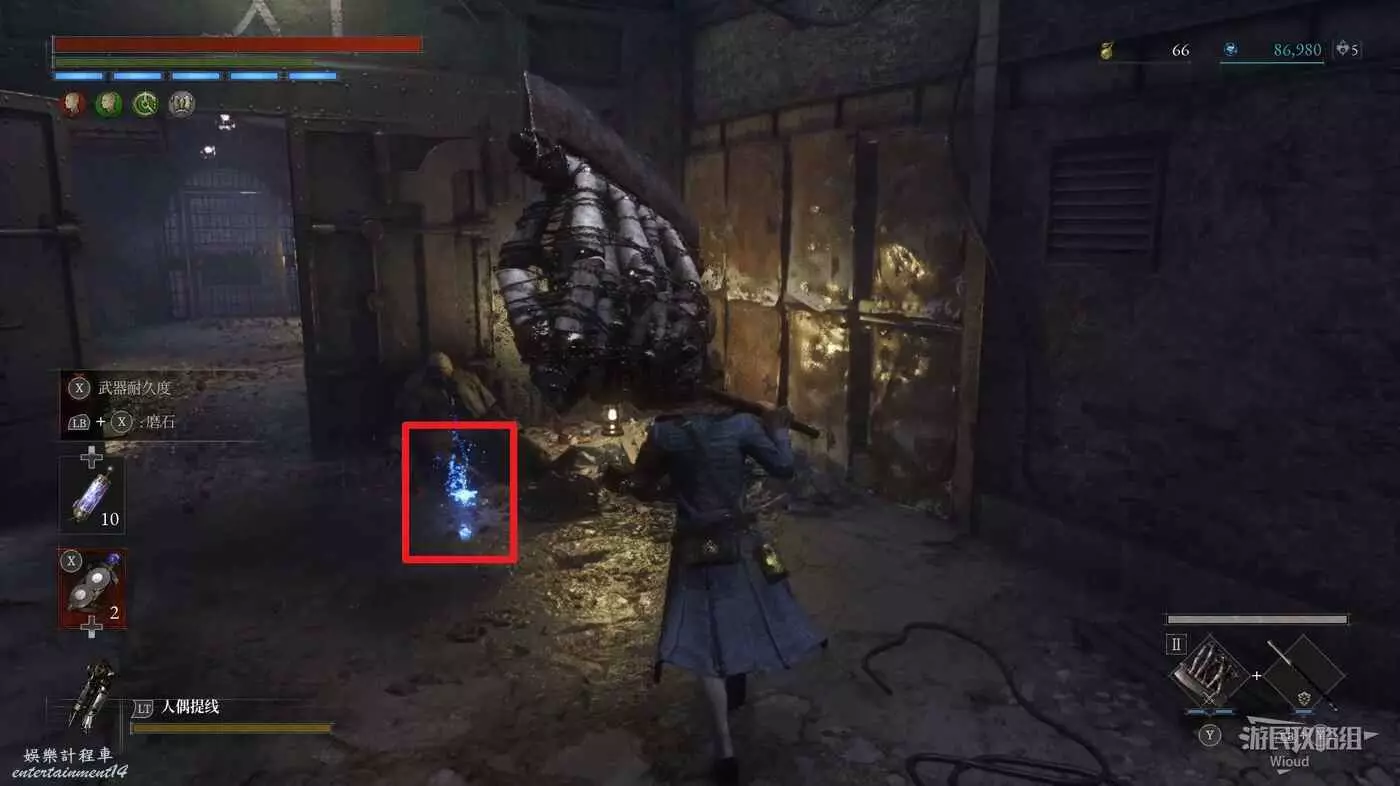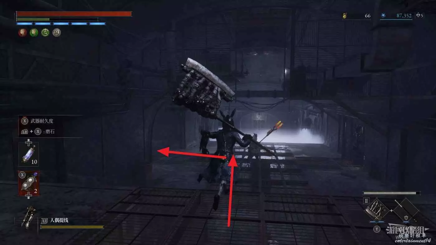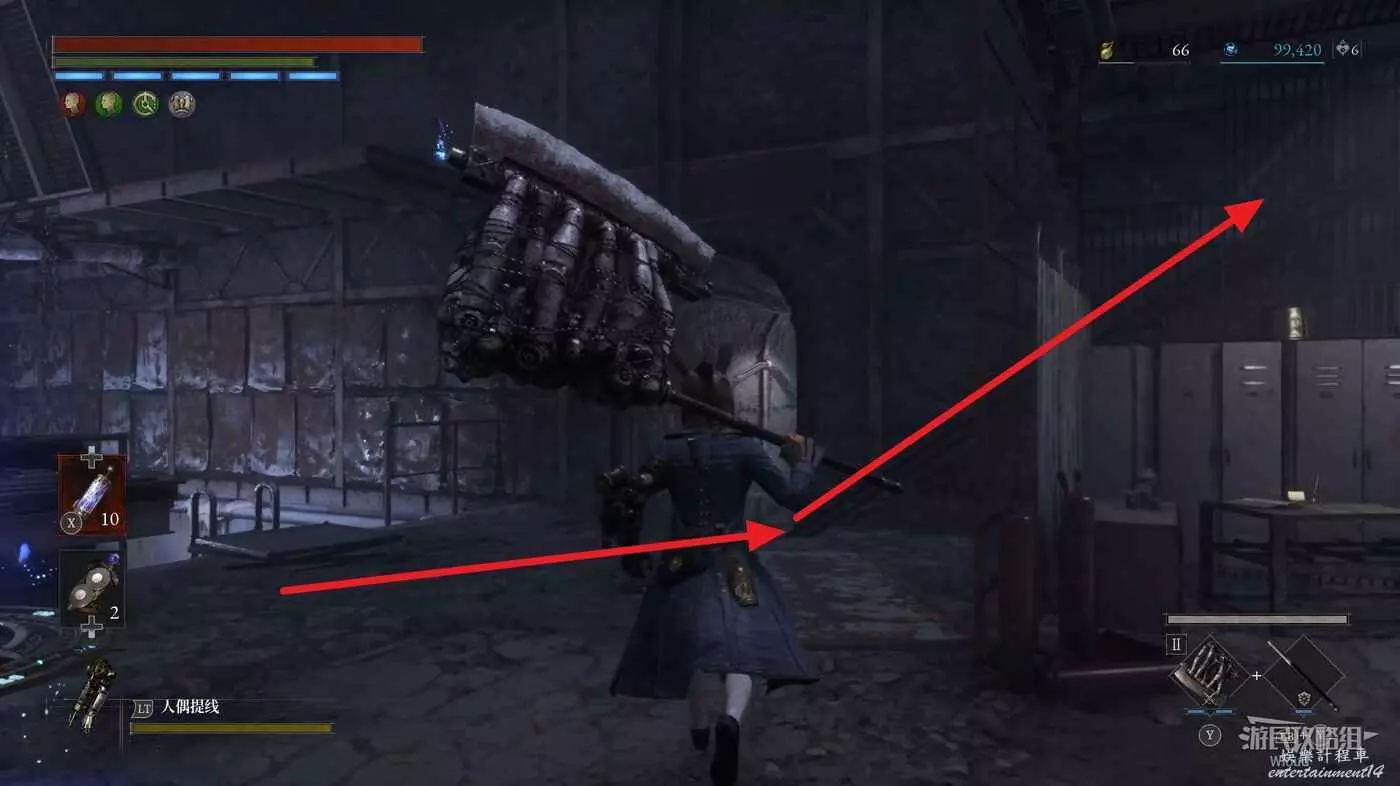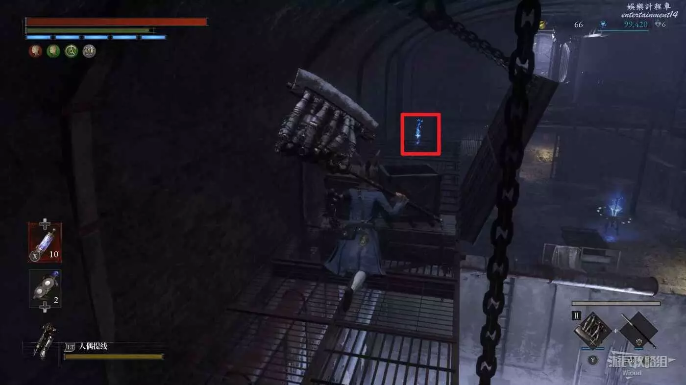 從【皮斯特裡斯海港】篝火開始,篝火處往下走到一個鋼筋橫樑處撿個道具,往下走,再次遇到推人的敵人。
