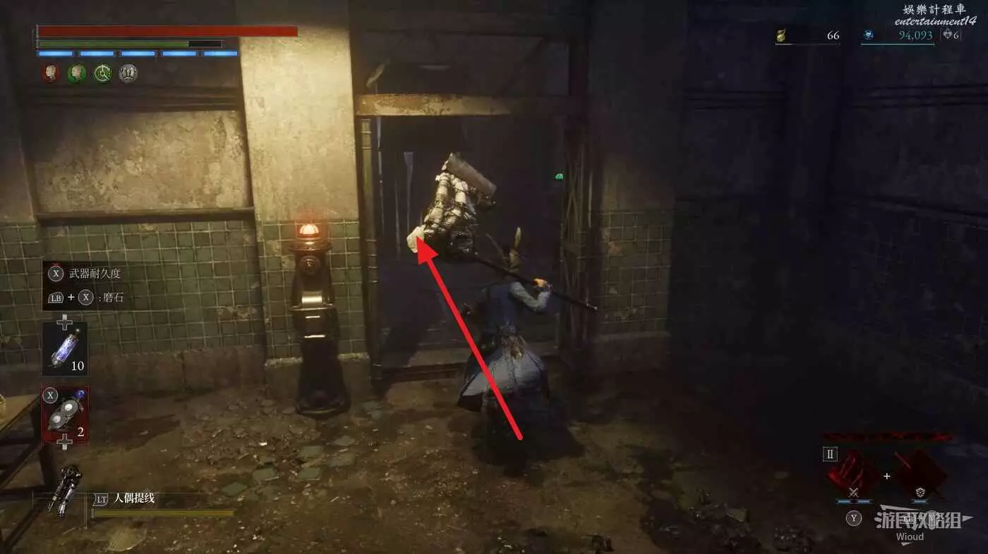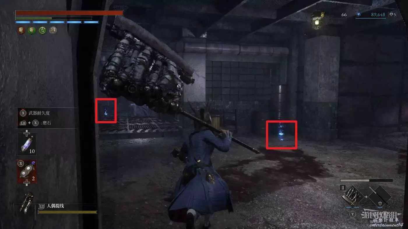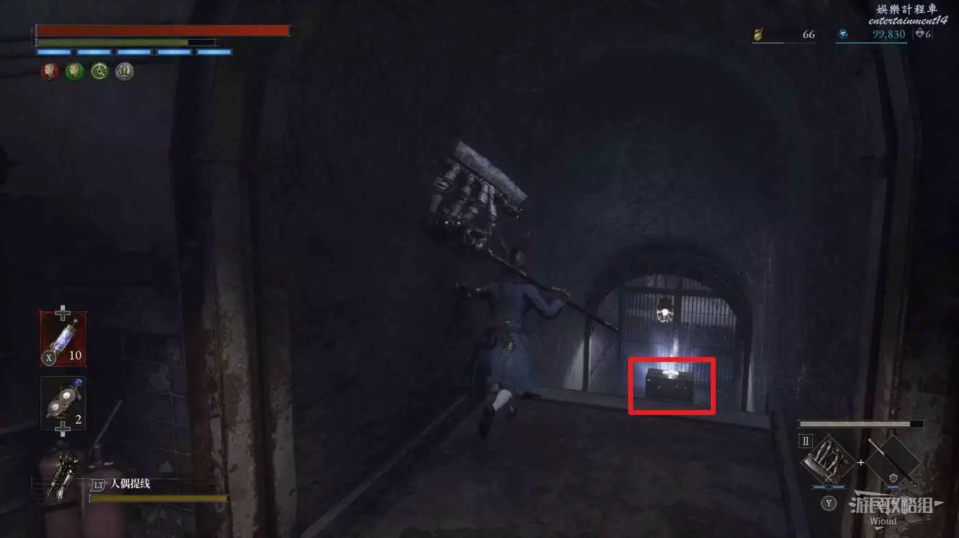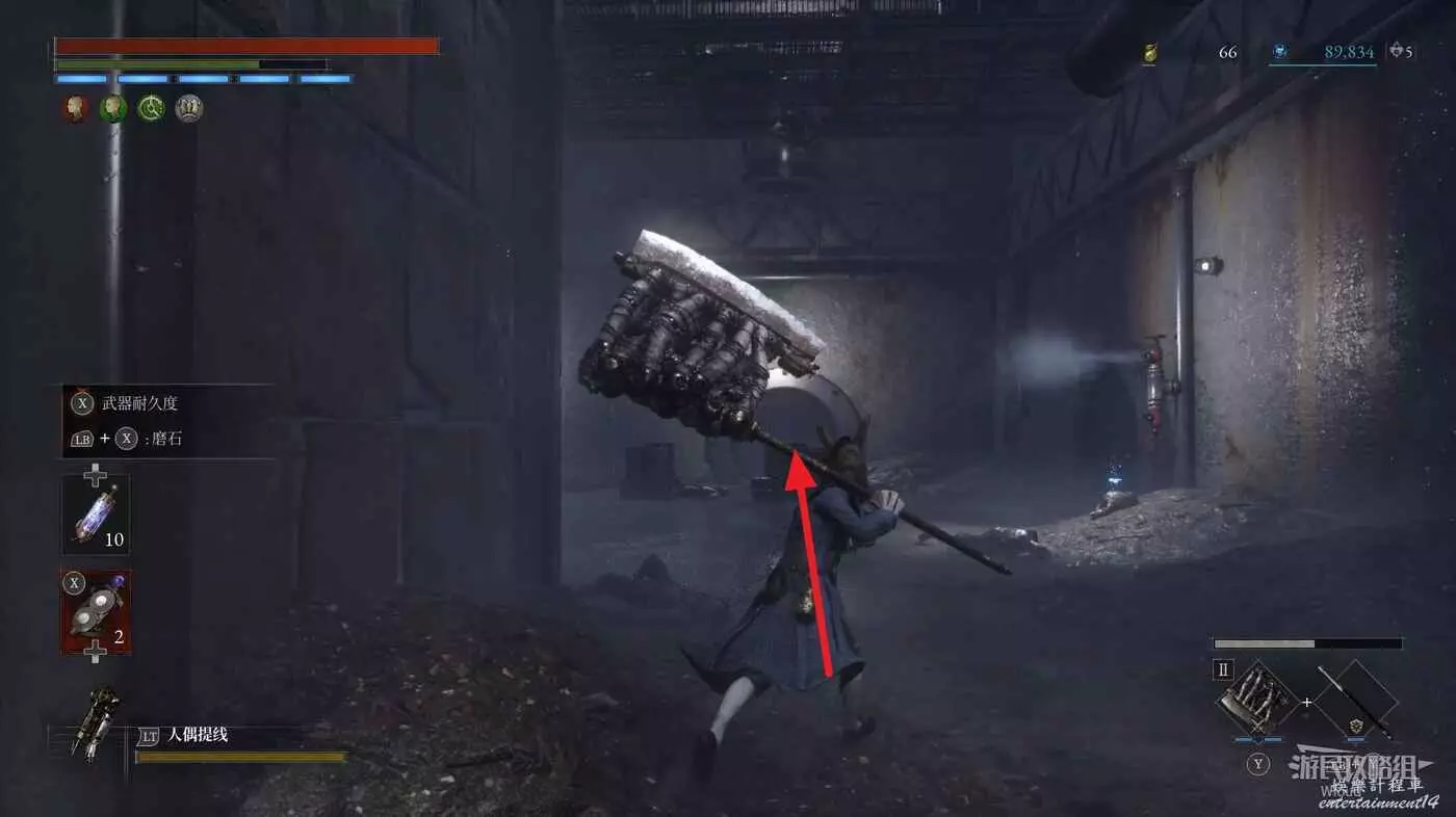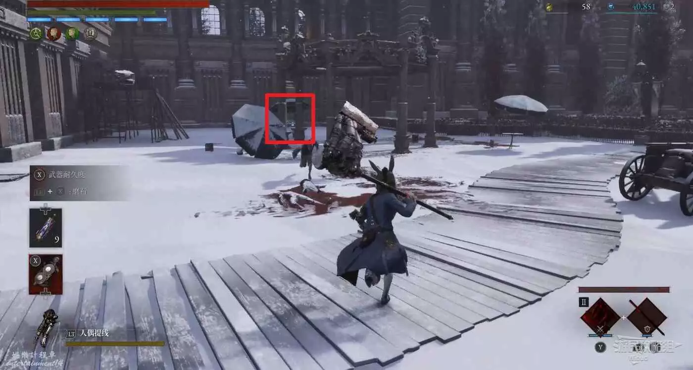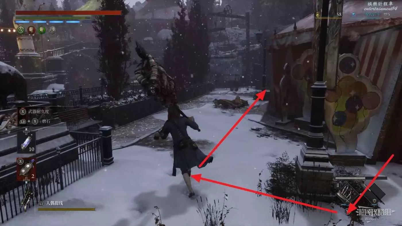 從【皮斯特裡斯海港】篝火開始,篝火處往下走到一個鋼筋橫樑處撿個道具,往下走,再次遇到推人的敵人。