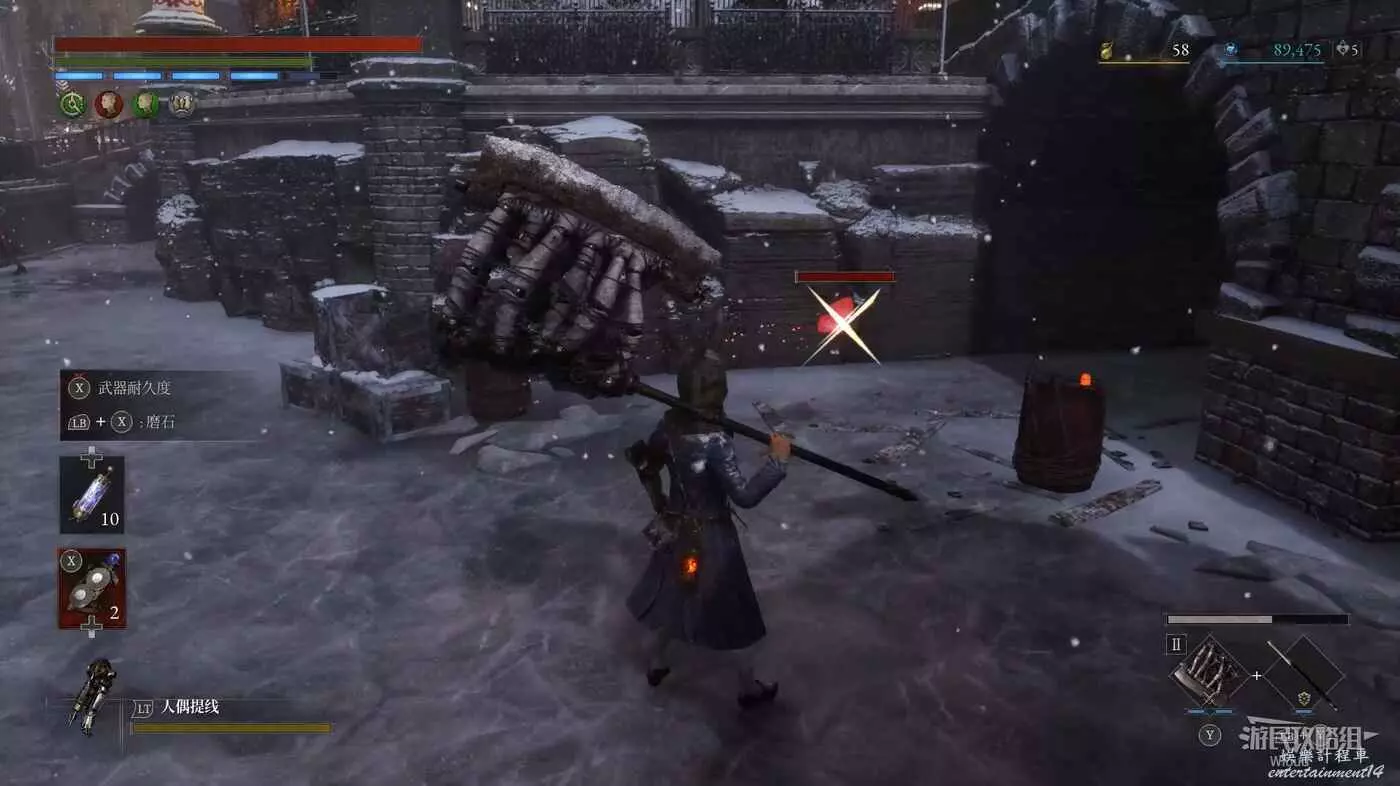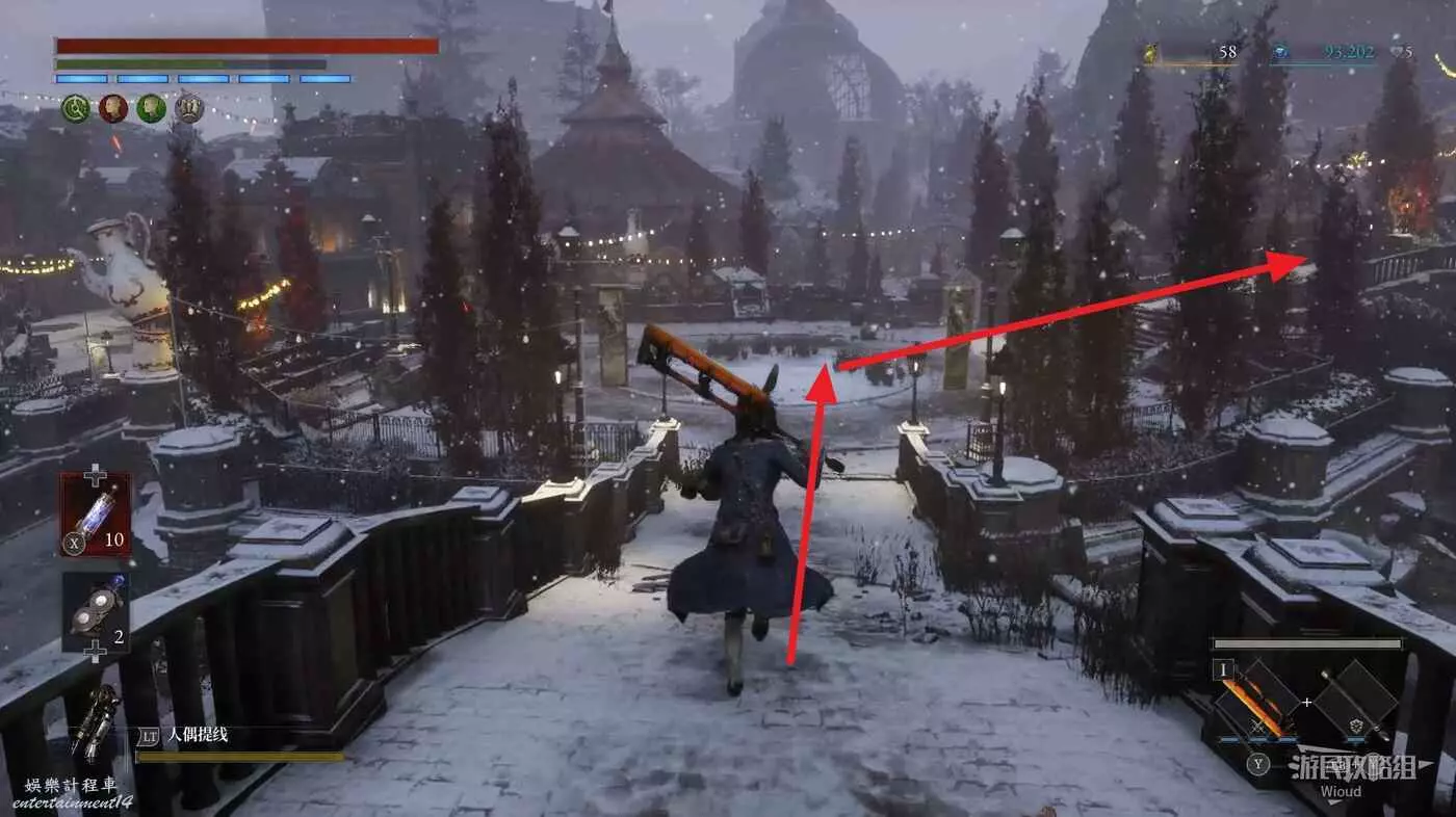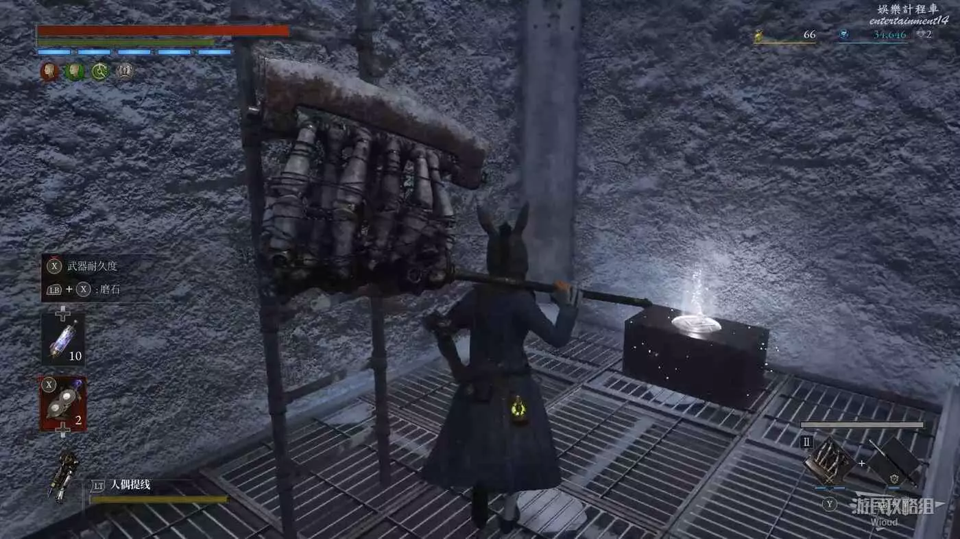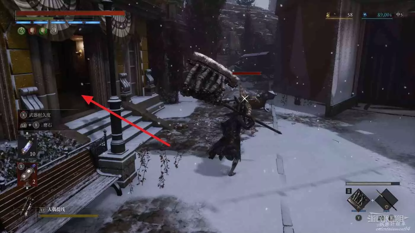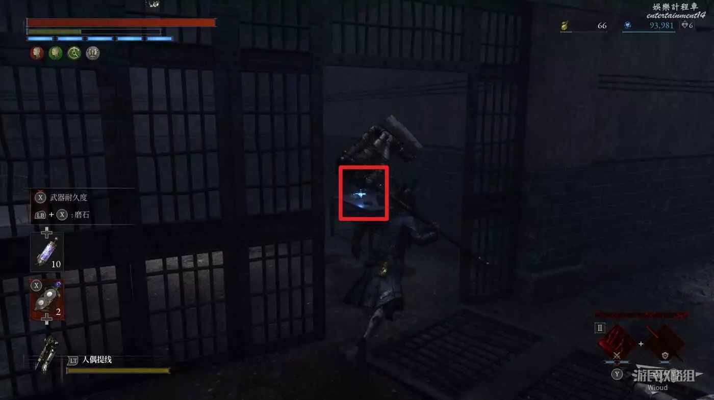 從【皮斯特裡斯海港】篝火開始,篝火處往下走到一個鋼筋橫樑處撿個道具,往下走,再次遇到推人的敵人。
