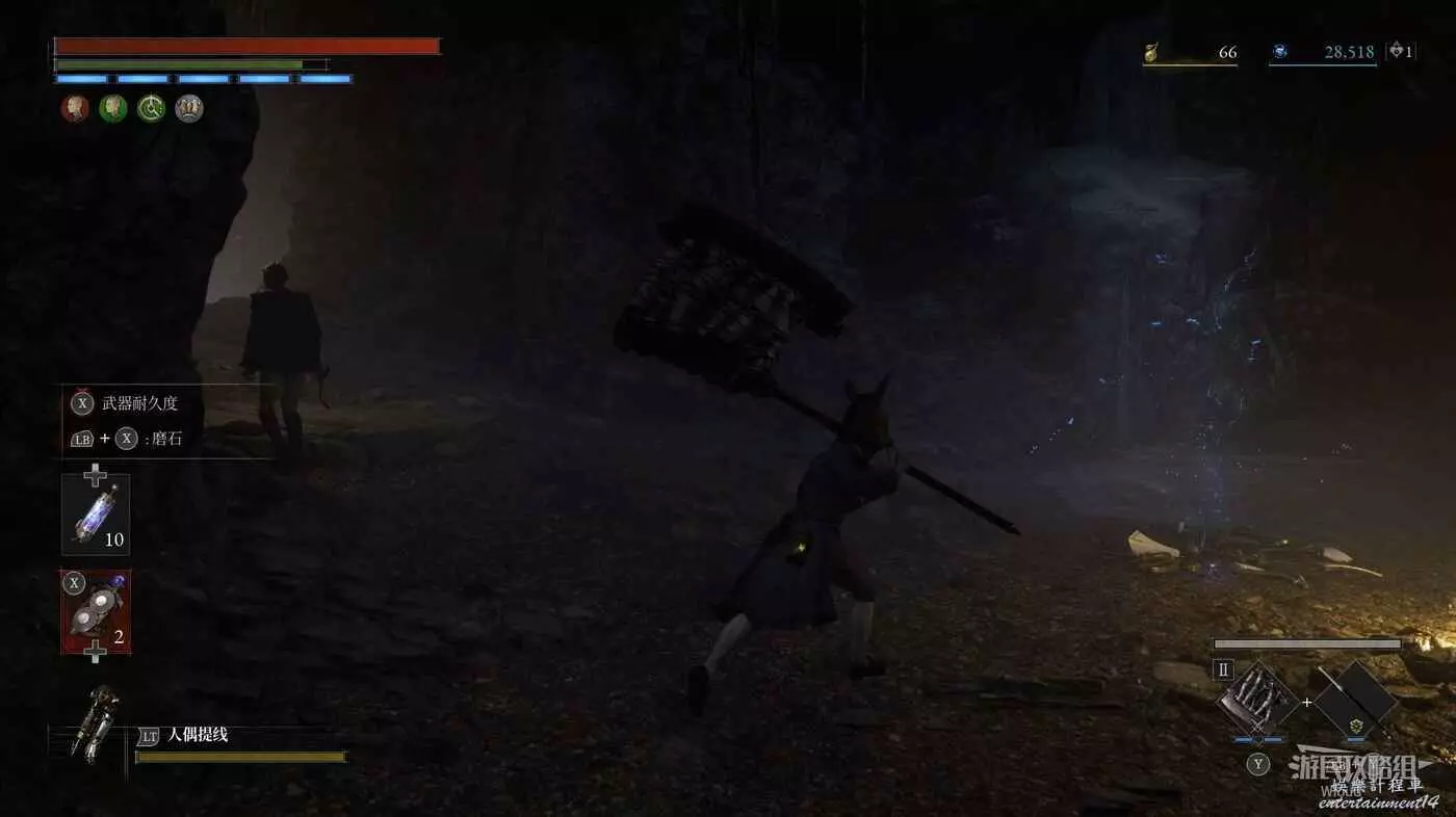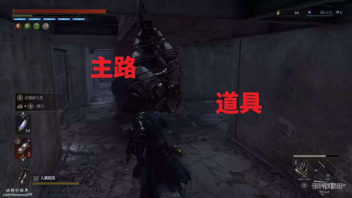 篝火右側通道旁有個樓梯,沿樓梯爬上去沿路走,在左側一個拐角找到一個需要黑兔洞鑰匙的房間,週邊一直繞到盡頭可撿一個道具,然後跳會篝火處,走右側通道。