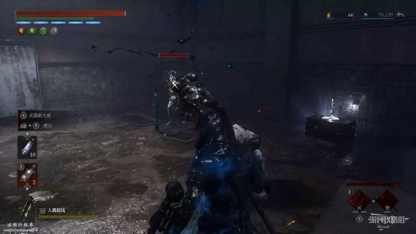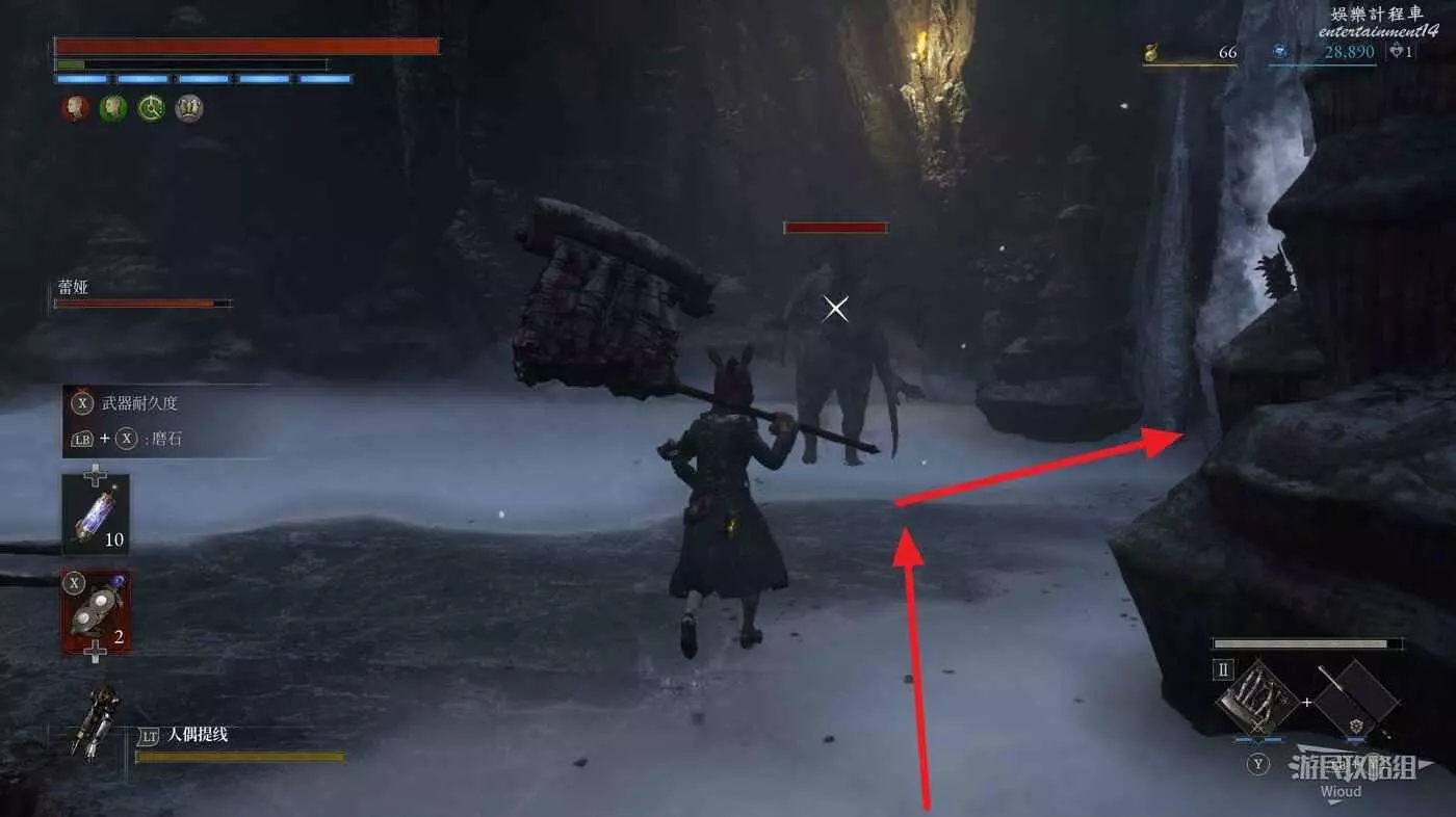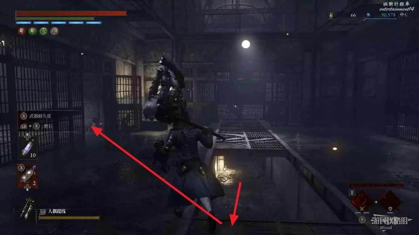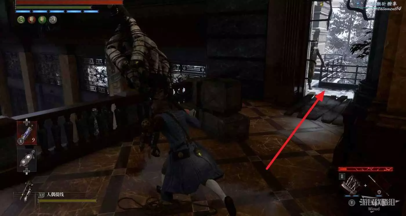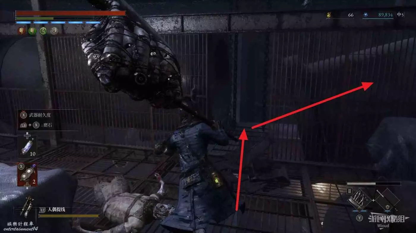 另一側出來後轉頭進入後方左側的牢房內,之前區域高處一直射我們的怪物就在裡面,把它幹掉爬旁邊的樓梯上2樓。