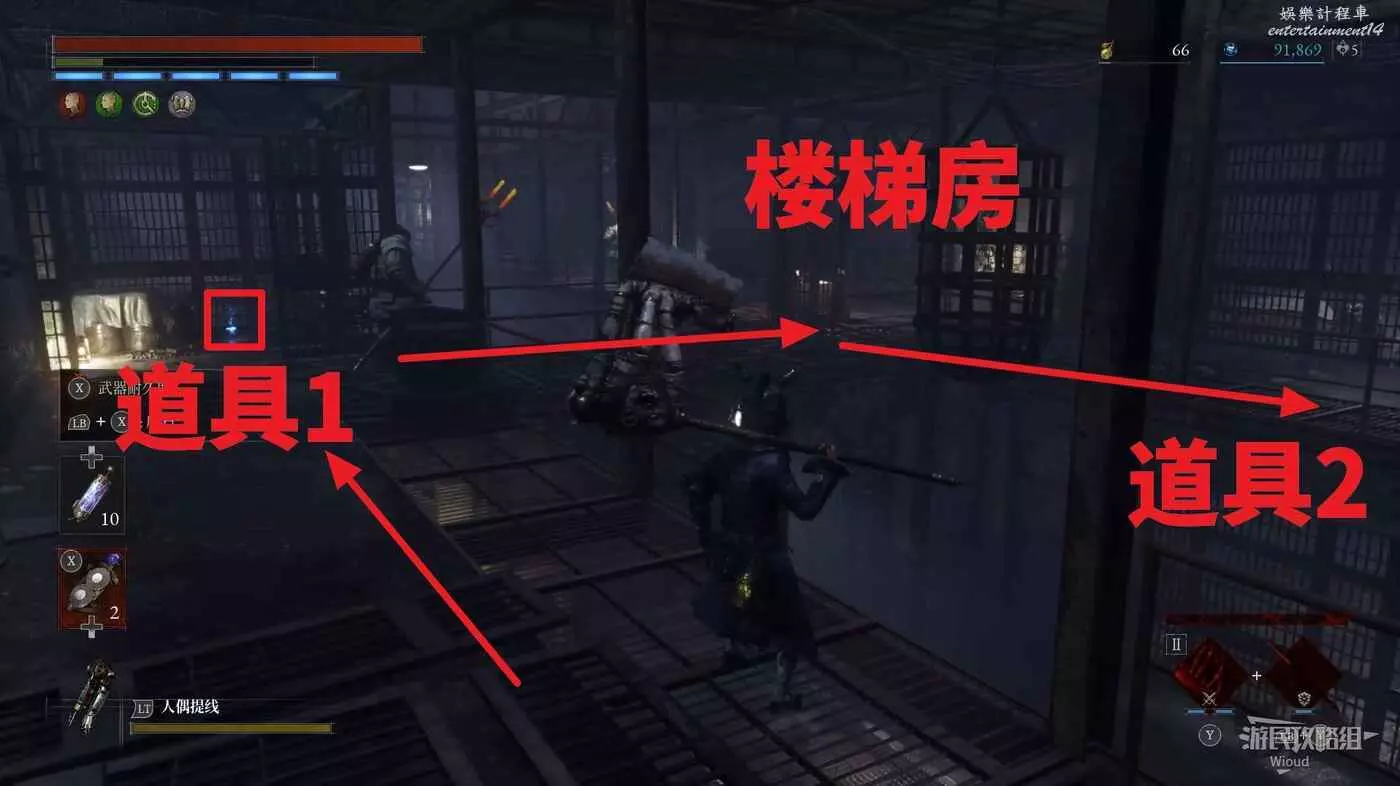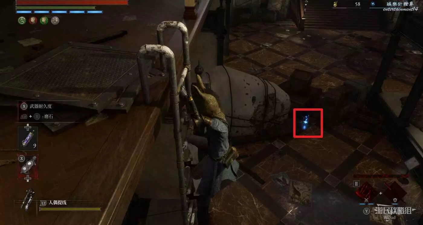 拾取完所有道具後,往高處道具點下面有燈光的門走。