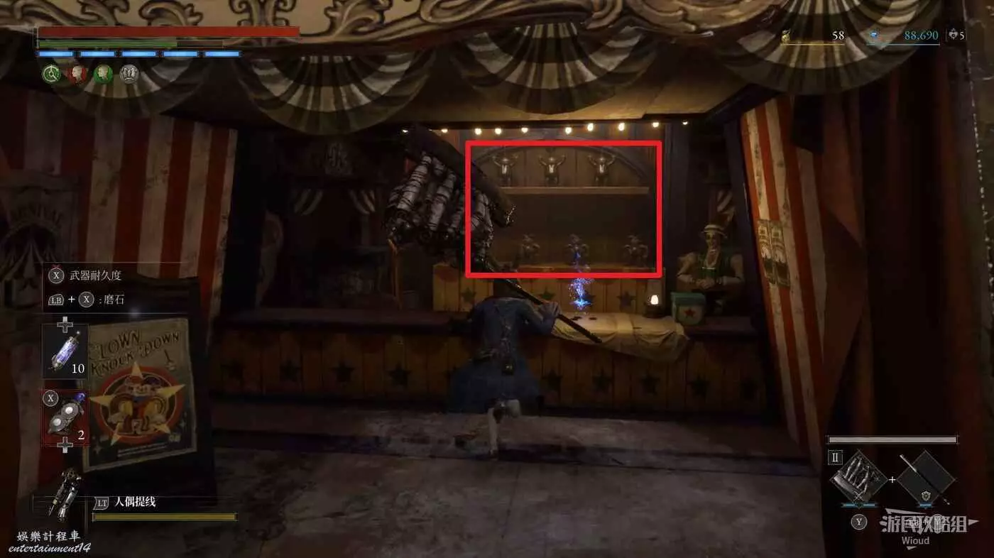 回到中間往左看,左側角落紅框處有個容易被忽略的道具點,往前方旋轉木馬位置走,注意進入旋轉木馬區域前右拐,有個小遊戲帳篷。