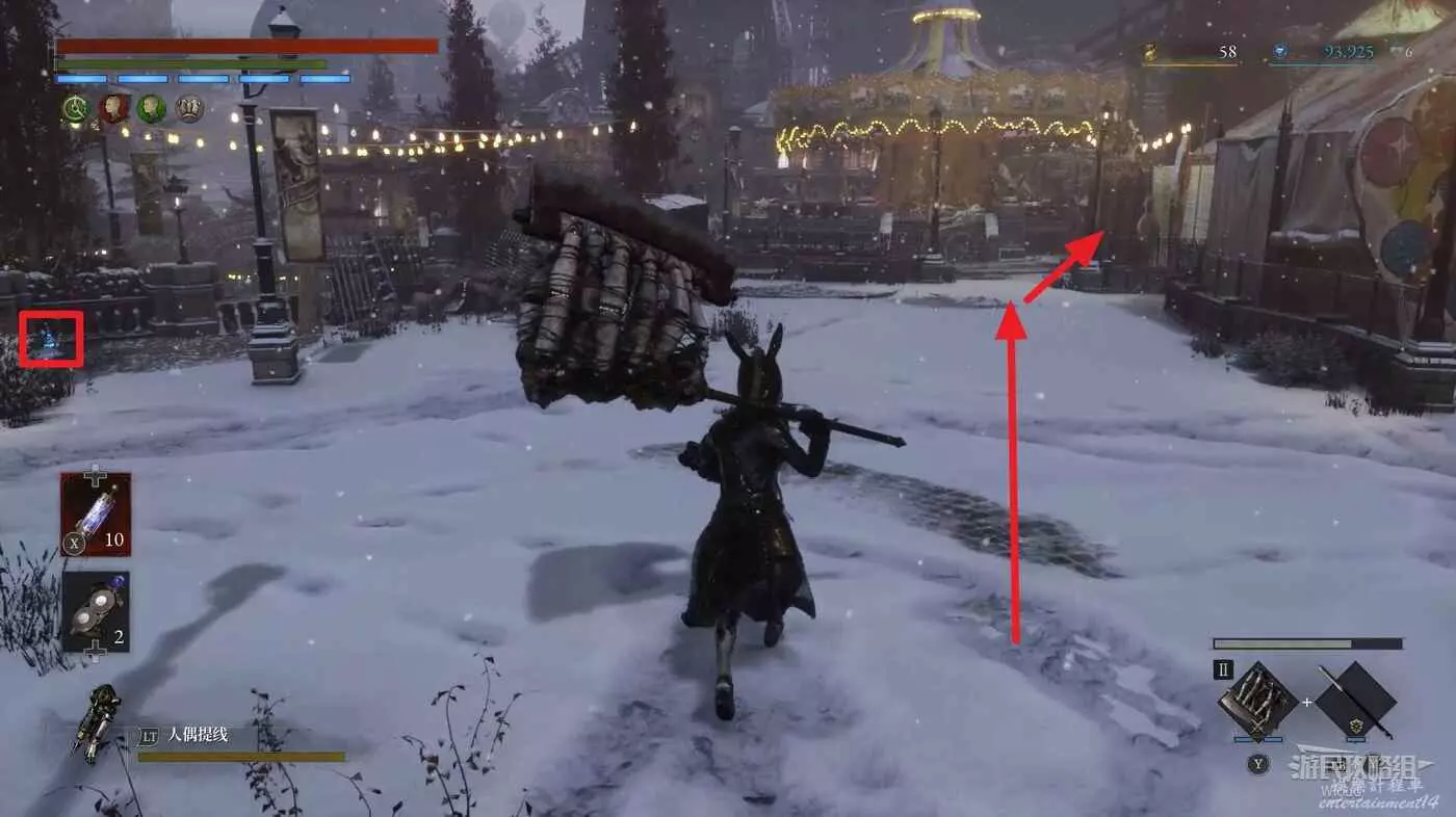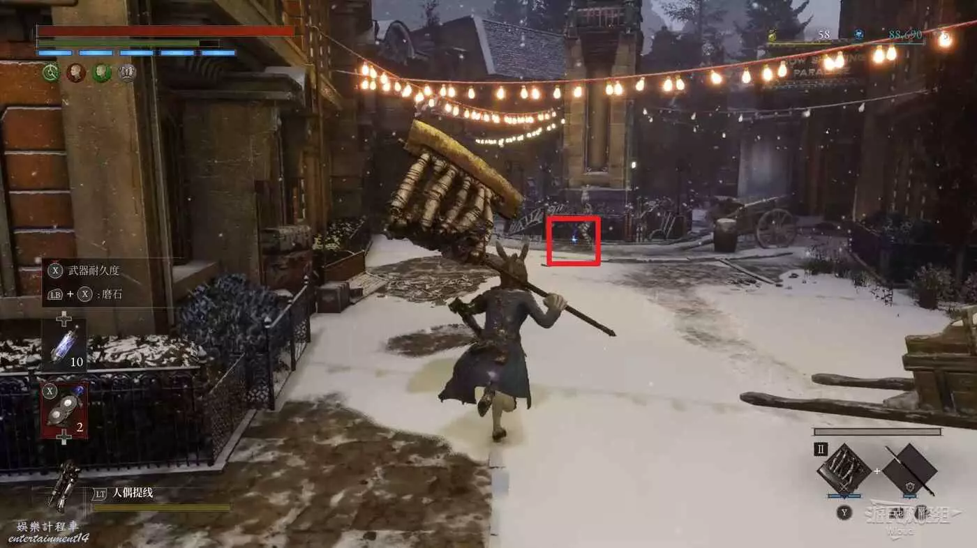 回到剛進這個區域的大入口往左走,不遠處紅框所示位置可以撿到第二個【狂歡幣】。
