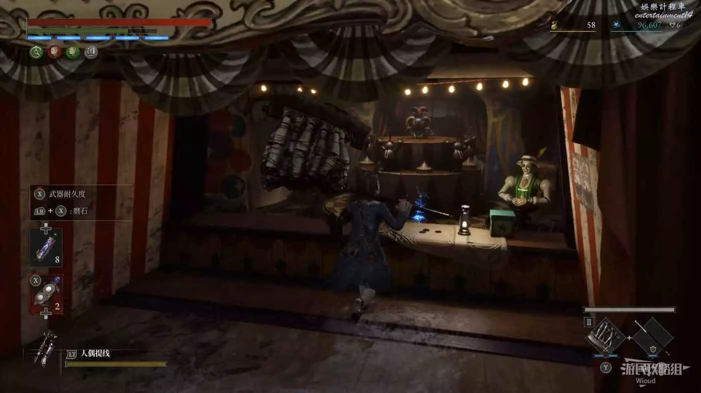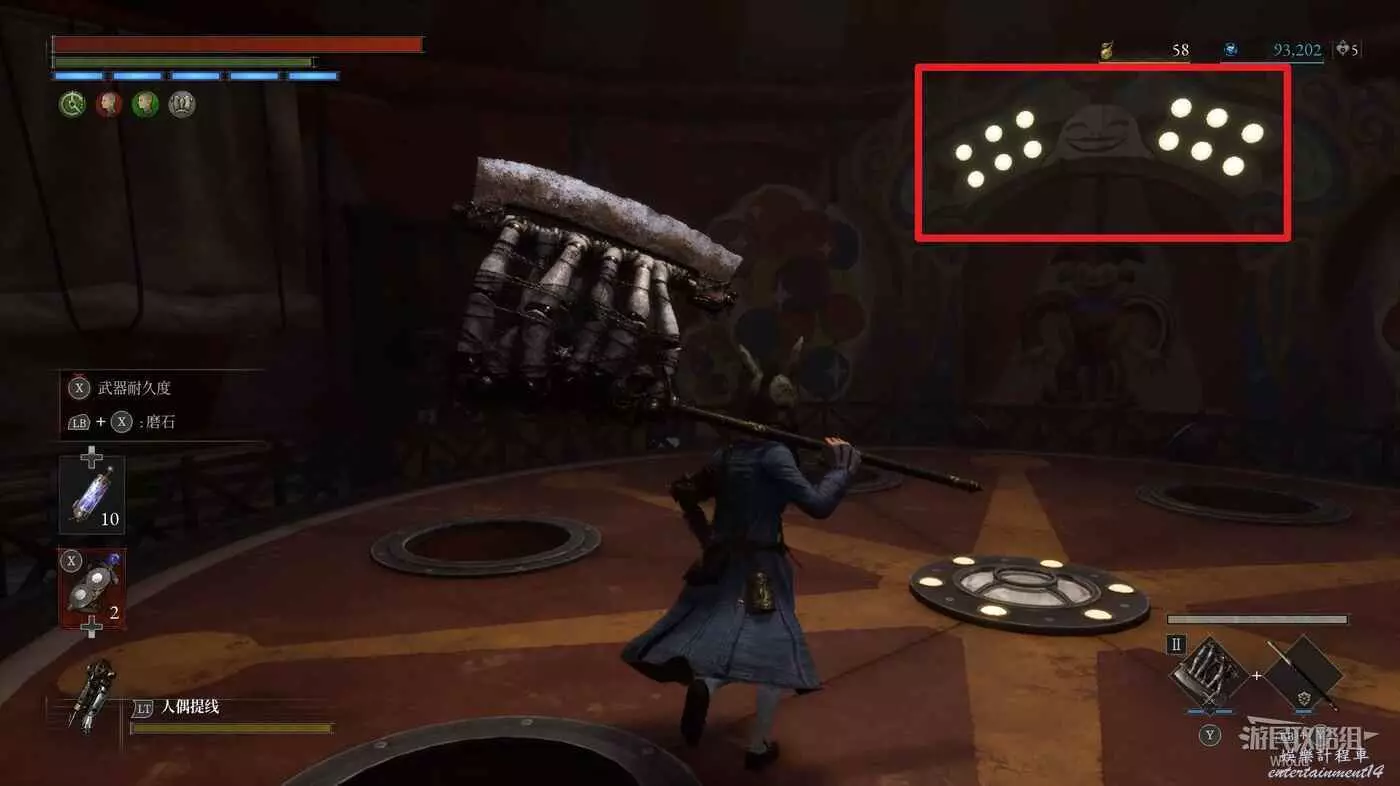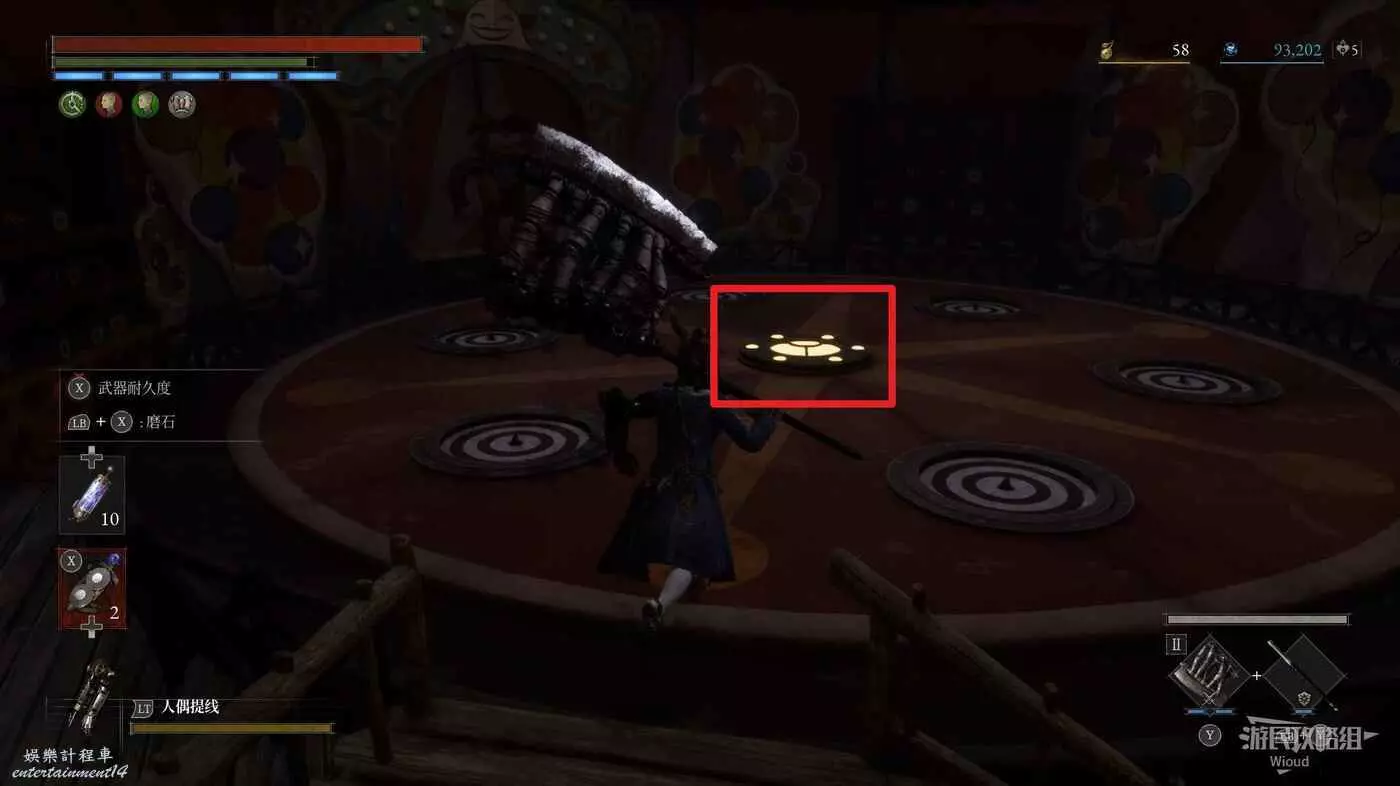 在右側的小丑玩偶處投入一個【狂歡幣】可獲得一個【契約滿月月光石】,在小丑玩偶前跳之前獲得的【踏踏舞】可獲得姿勢【歡呼】與【戰略家護身符】。